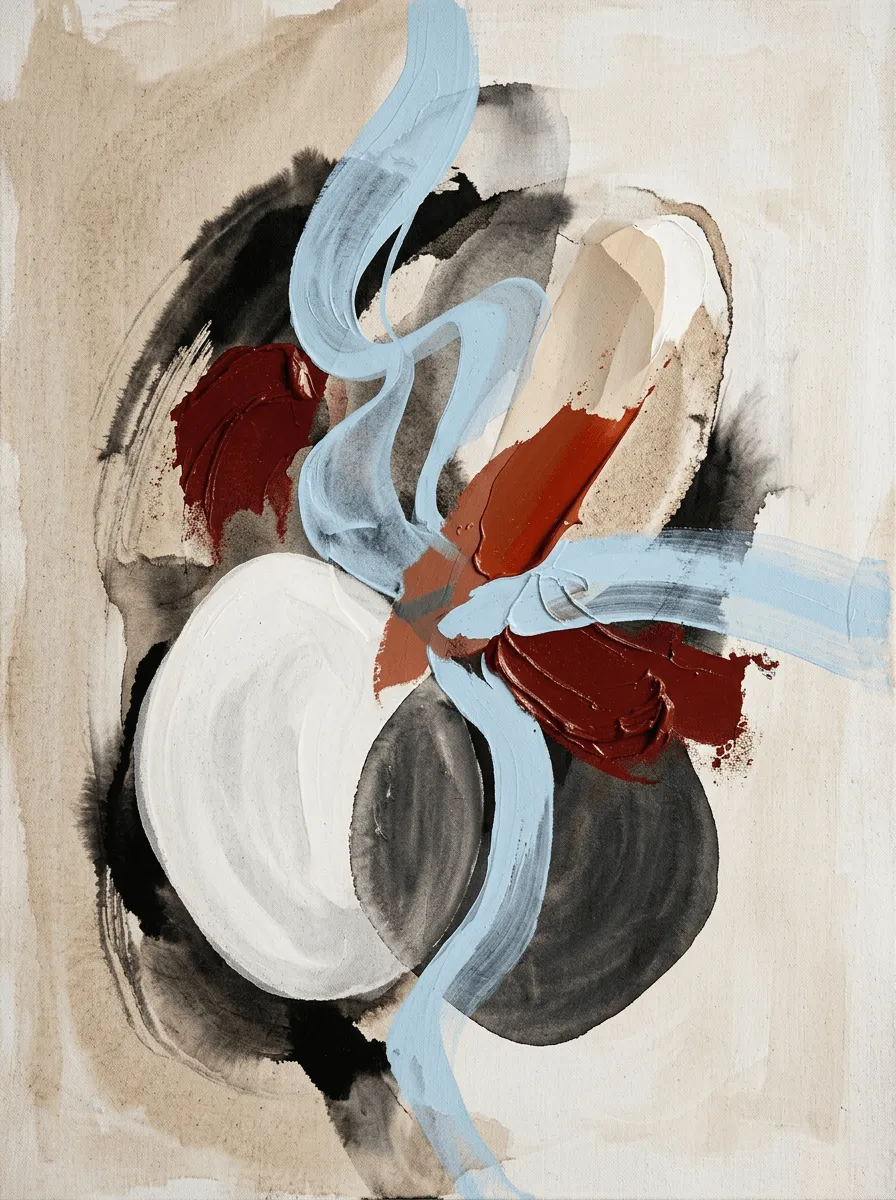 This striking mixed media artwork combines bold brushstrokes, charcoal textures, and layered paint in crimson, blue, and neutral tones. A contemporary canvas print that brings sophisticated, artistic energy to modern living spaces and galleries.