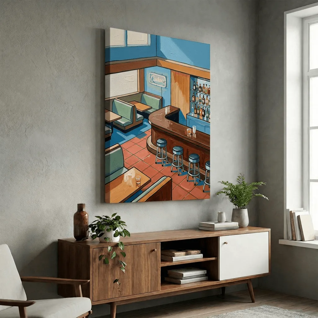 Rendered in bold acrylic strokes with a vintage aesthetic, this retro bar scene captures mid-century charm with warm wood tones and cool blue walls. A striking canvas print that brings nostalgic character and sophisticated style to any room.