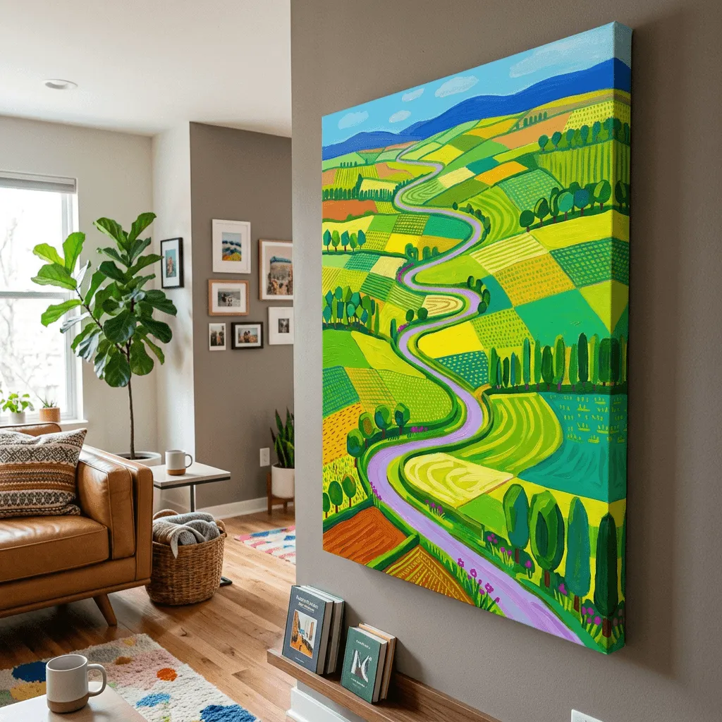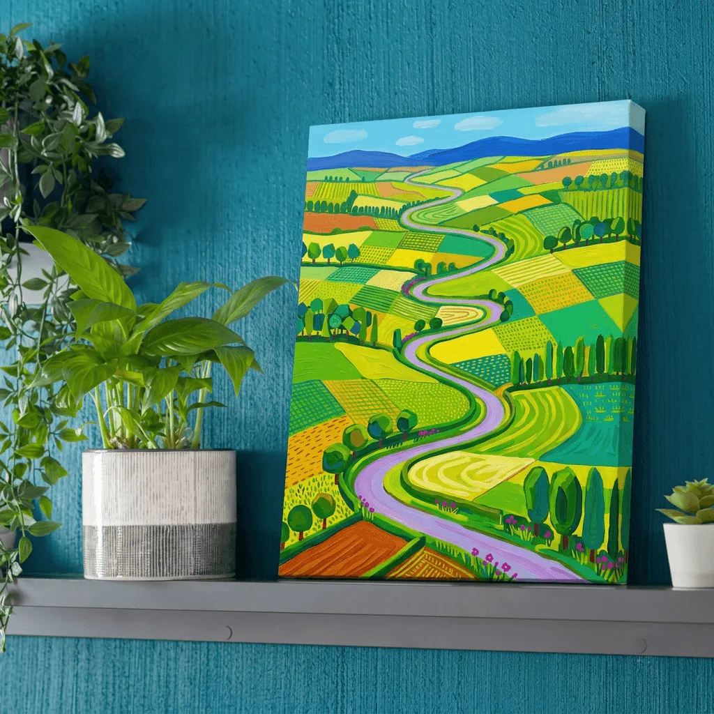 Rendered in vibrant acrylic with bold geometric fields and a winding river, this contemporary landscape art brings energy and movement to any room. Rich greens, golds, and purples create a striking aerial view perfect for modern home decor.