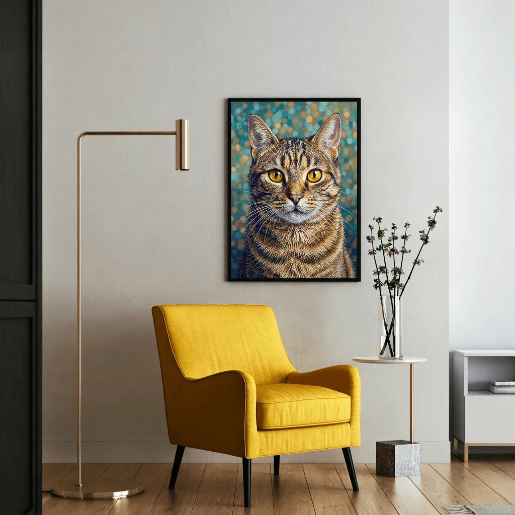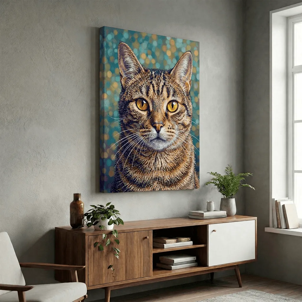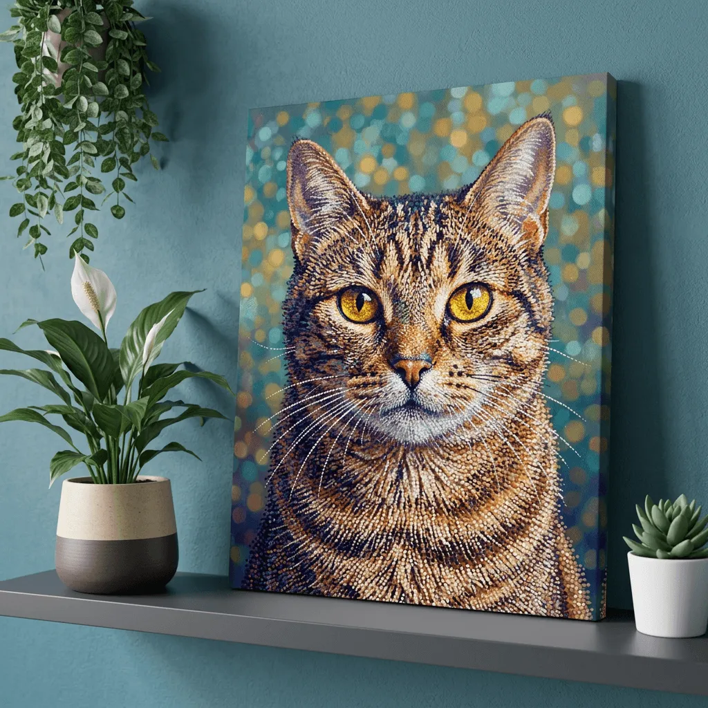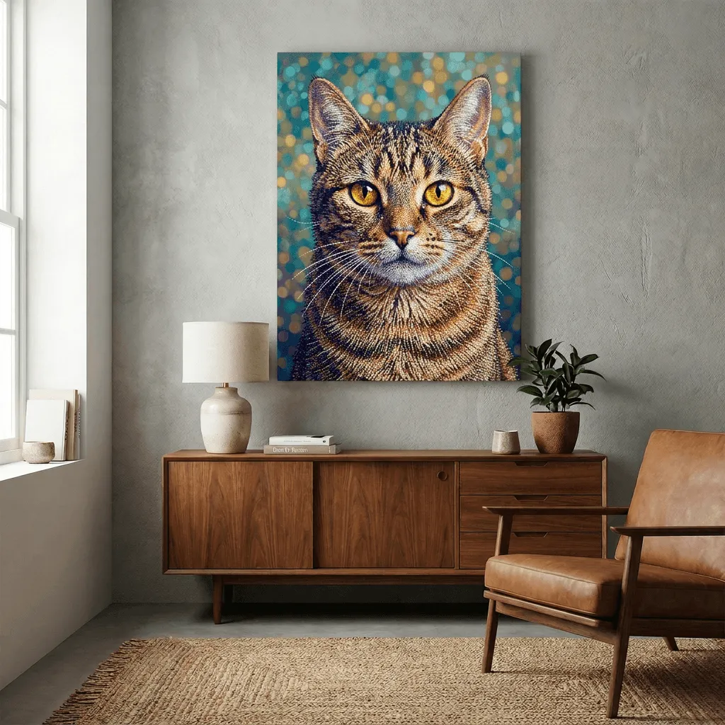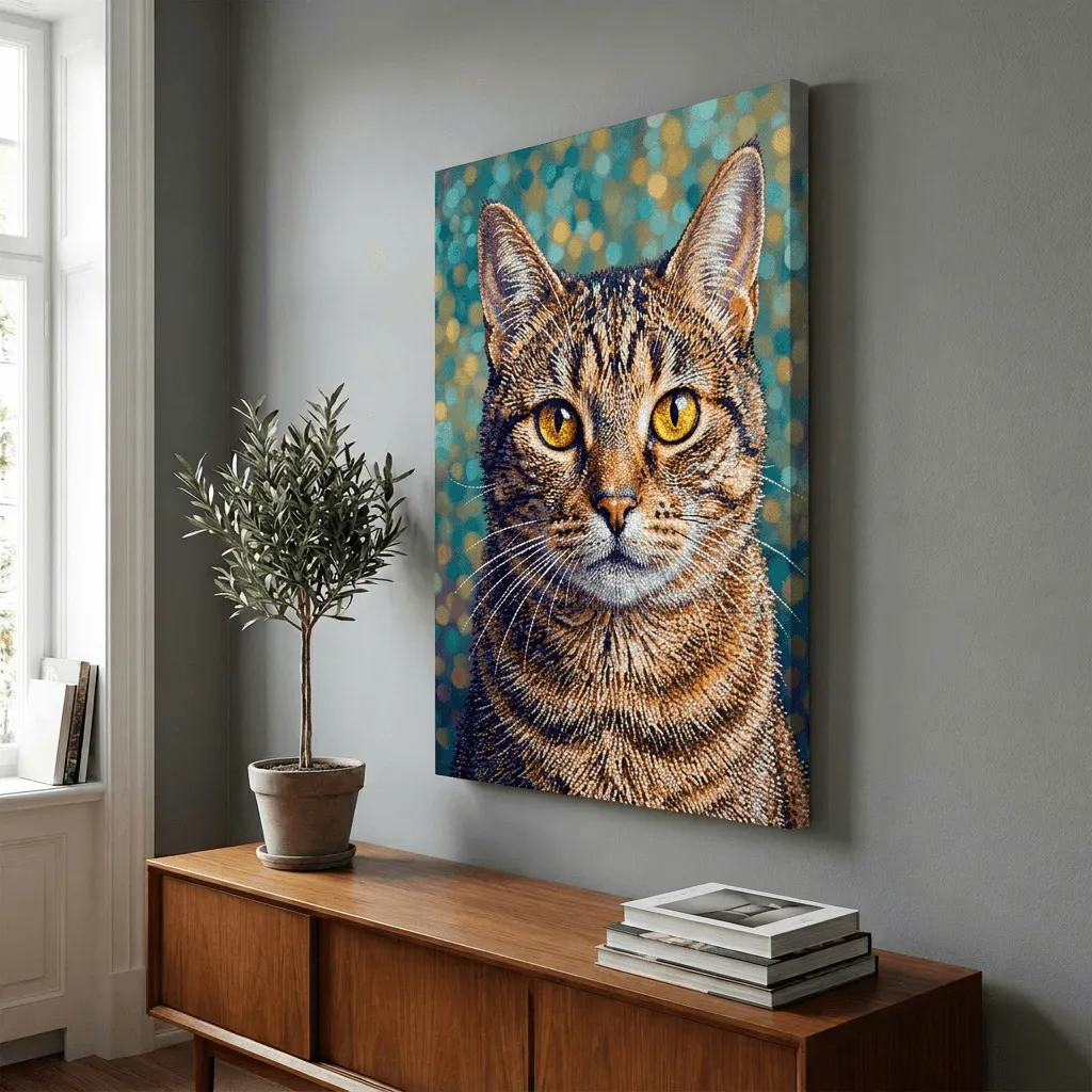This striking mosaic art style transforms a tabby cat into a stunning canvas print with intricate tile-like textures and luminous golden eyes. Rich amber and navy tones create depth against a soft bokeh background, perfect for pet lovers seeking bold, contemporary wall art.