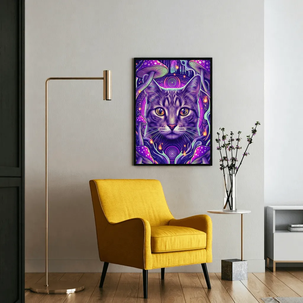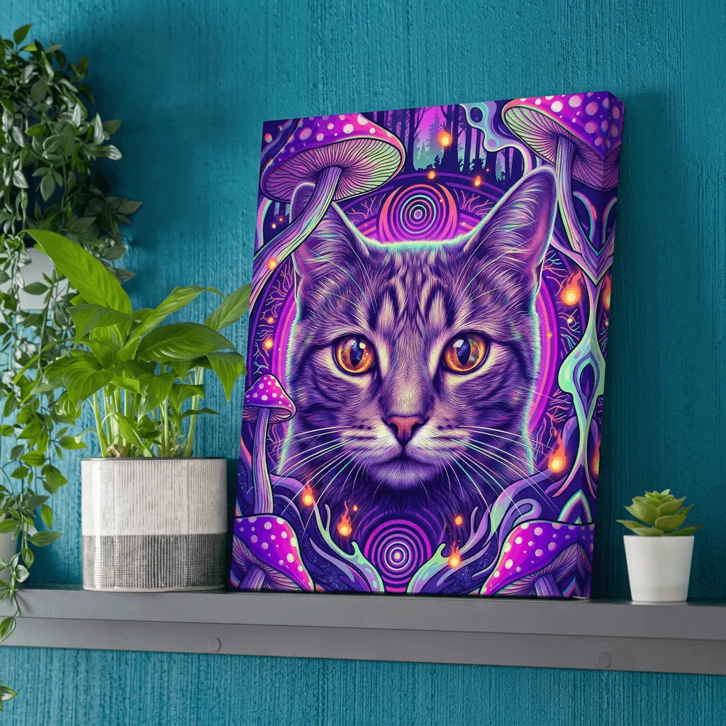 Rendered in vibrant neon pop art style with striking golden eyes and hypnotic concentric patterns. This bold, psychedelic canvas print features a mesmerizing cat surrounded by luminous mushrooms and cosmic swirls—a captivating wall art piece that brings electric energy to any modern space.
