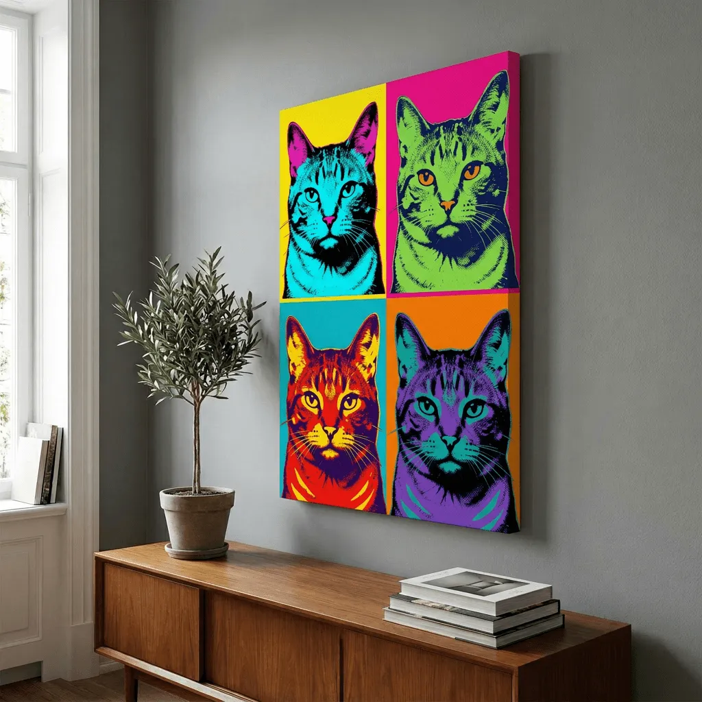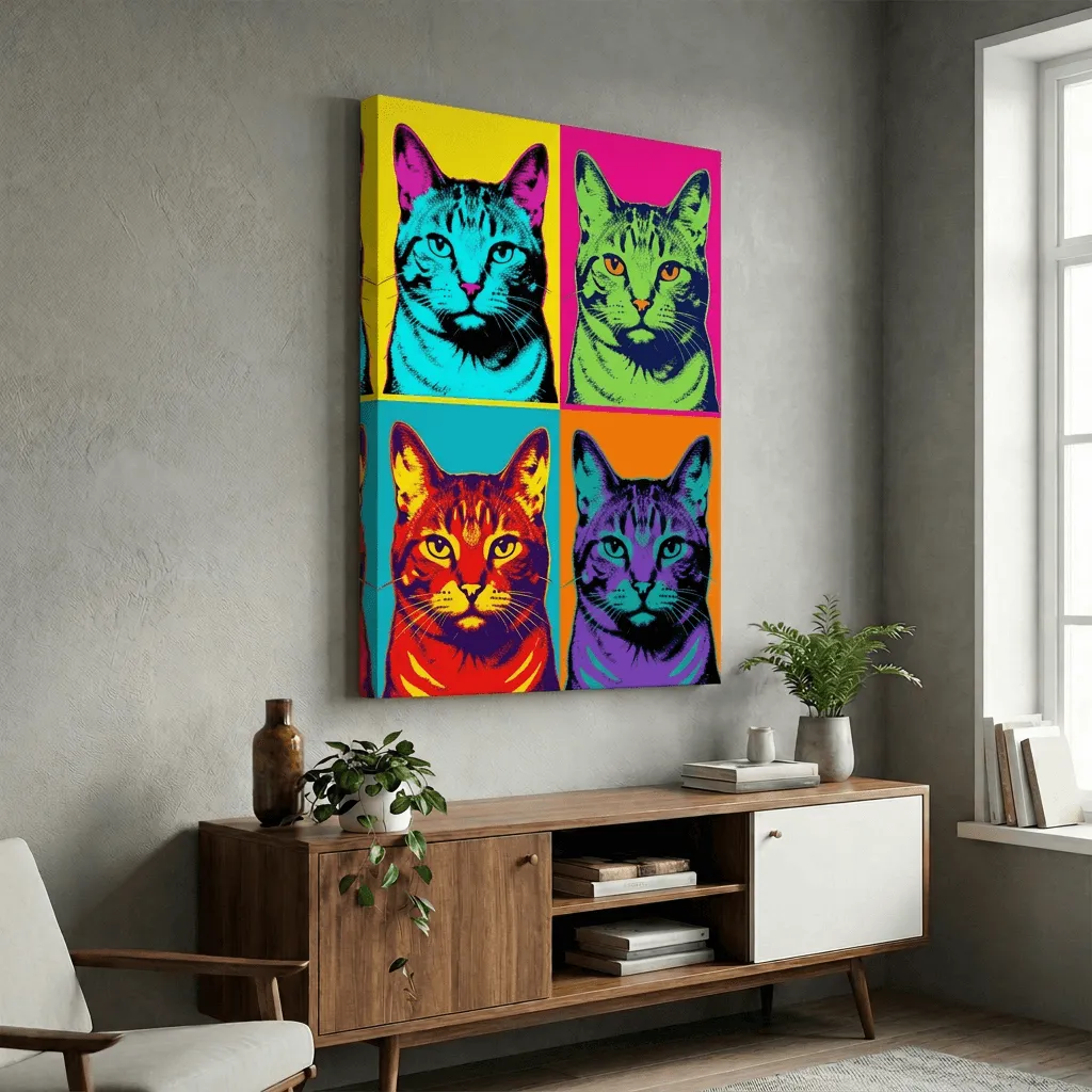 Vibrant pop art style cat portrait featuring bold neon color blocking and high-contrast black outlines. This striking canvas print showcases a four-panel composition with vivid yellows, magentas, cyans, and oranges that brings contemporary energy to any room.
