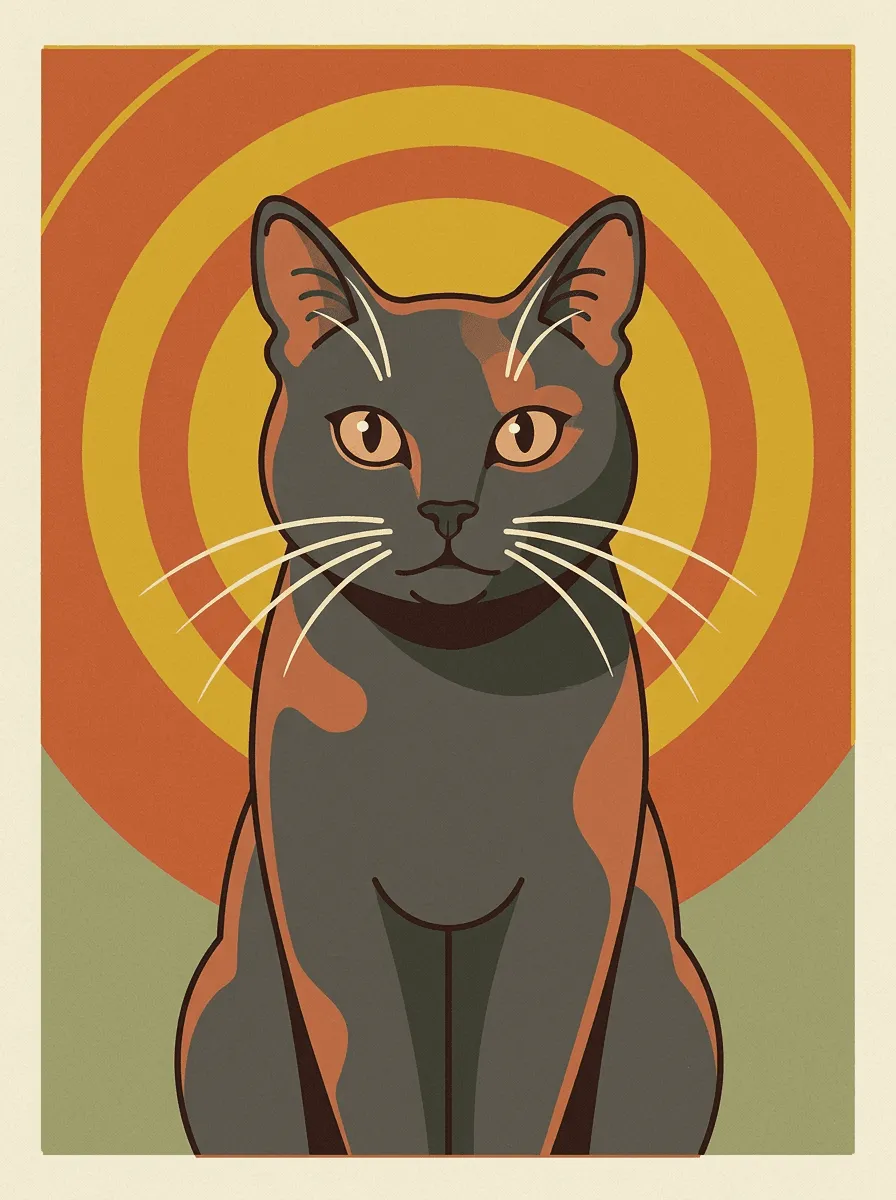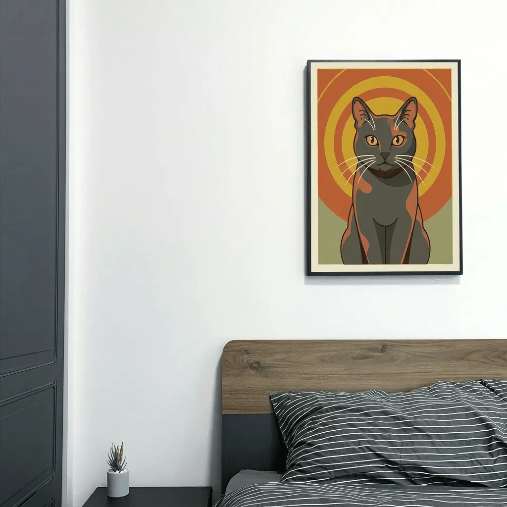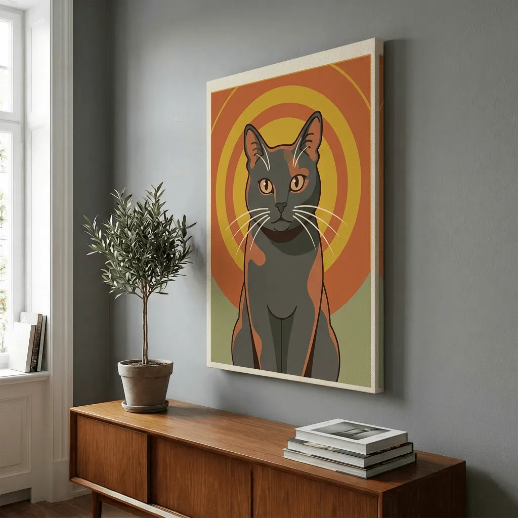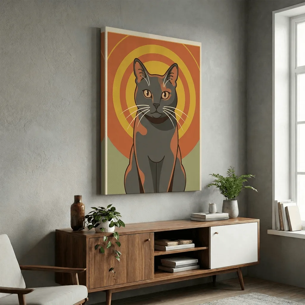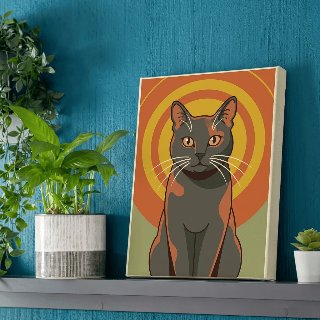 A striking pop art composition featuring a stylized cat with a luminous golden halo and bold color blocking. Rich warm tones and geometric precision create a contemporary canvas print that brings playful sophistication to any room.