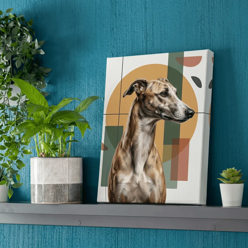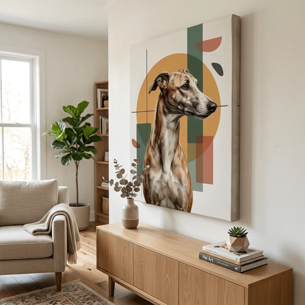 A striking realistic dog portrait rendered with meticulous detail against an abstract geometric background of warm golds, sage greens, and terracotta tones. This contemporary canvas print combines lifelike animal portraiture with modern geometric design, perfect for pet lovers seeking sophisticated wall art.