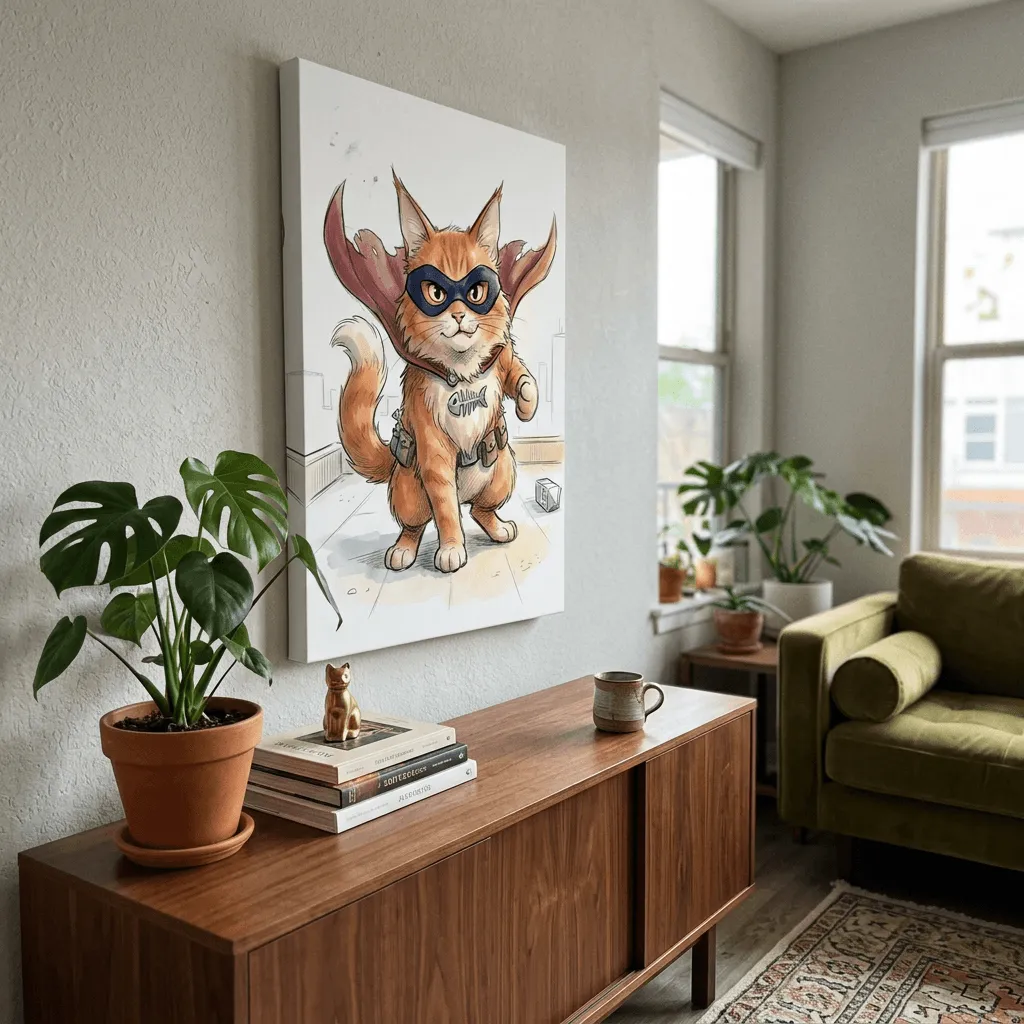 This charming ink and watercolor artwork features a bold, expressive cat character donning a superhero mask and utility belt. The soft watercolor washes and detailed ink linework create a playful, whimsical style perfect for adding personality to any room.