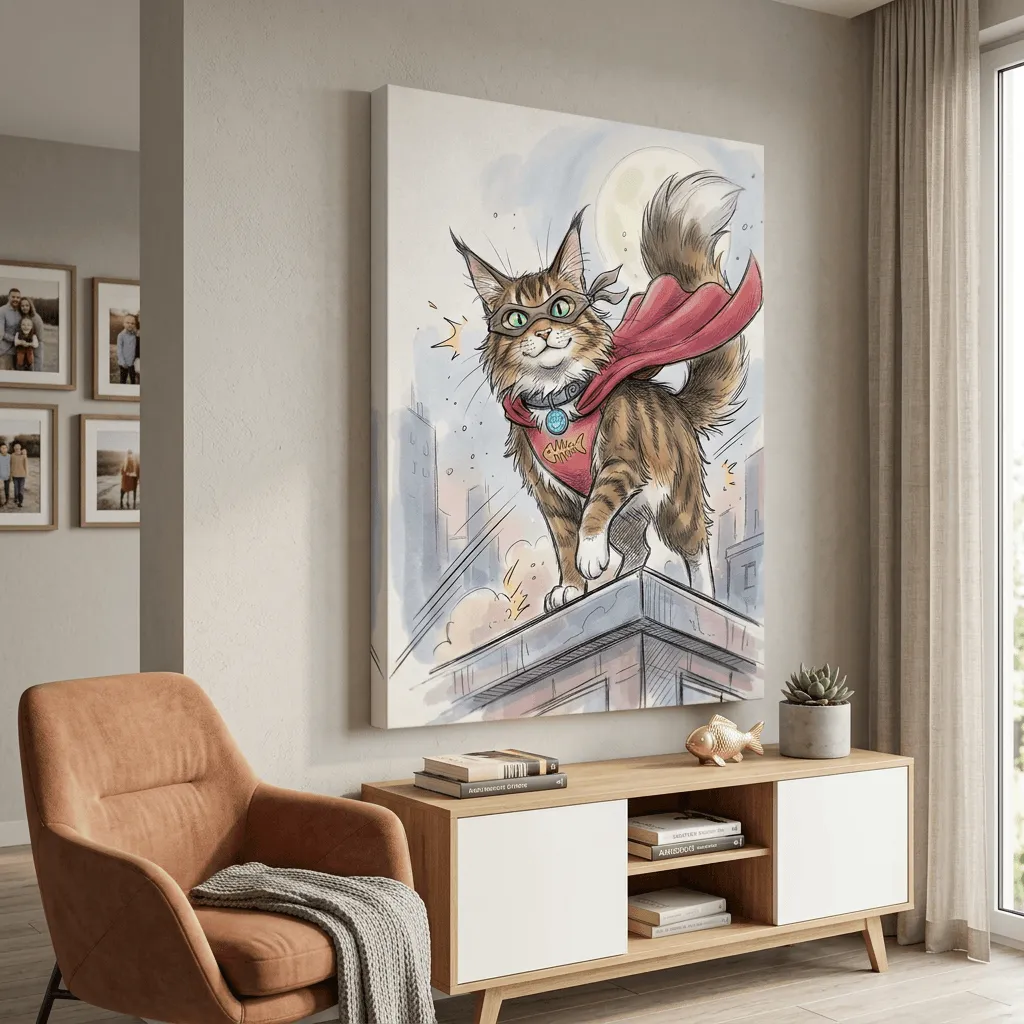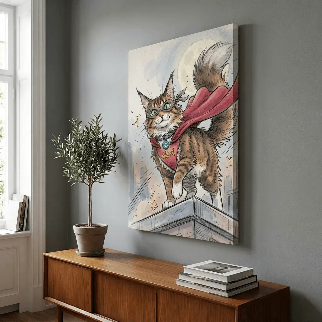 This charming ink and watercolor artwork features a heroic tabby cat perched atop a city rooftop, complete with striking green eyes, red cape, and paw medallion. The delicate watercolor washes and expressive pen linework create a playful, whimsical canvas print perfect for adding personality to any room.