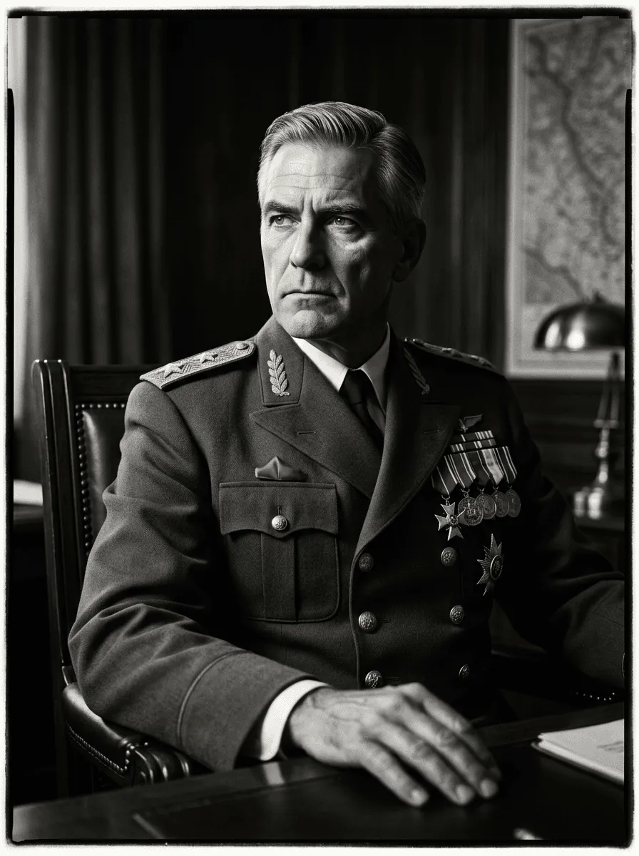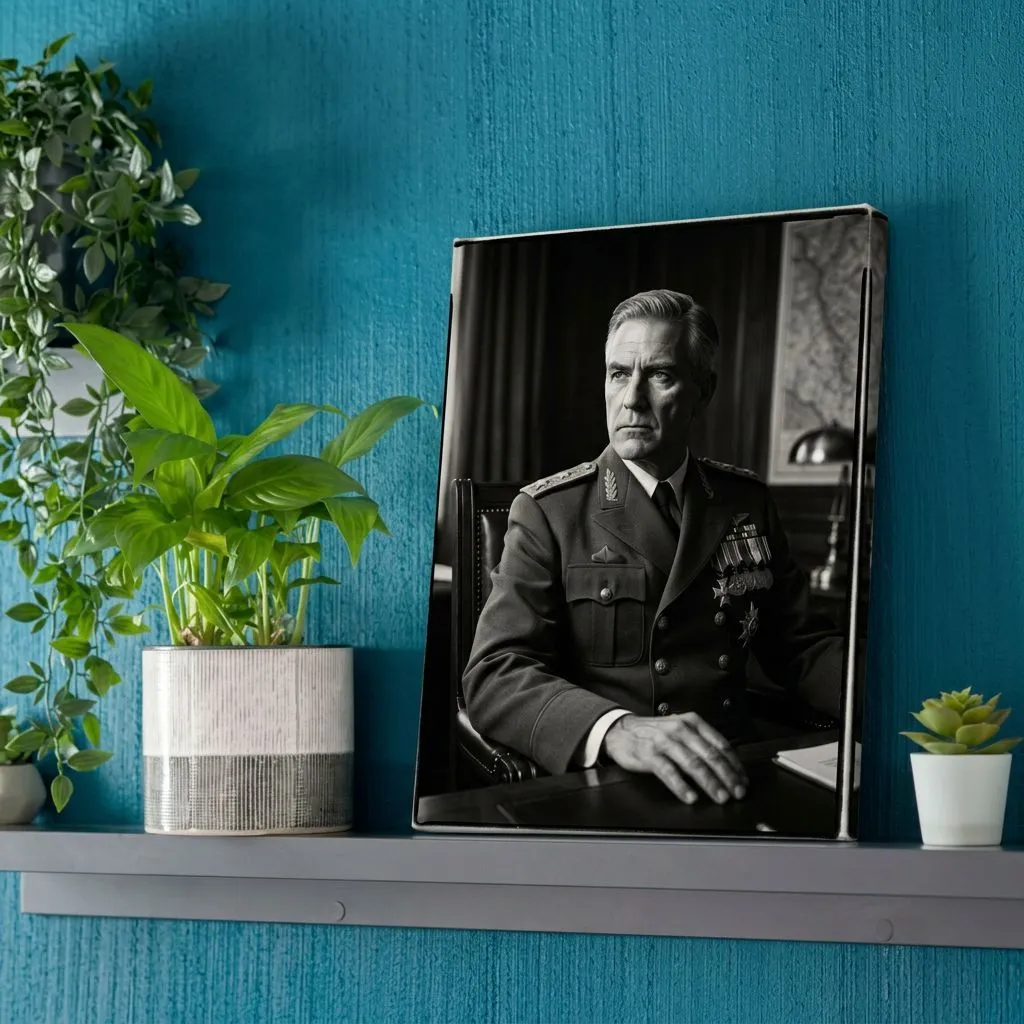 A striking charcoal-rendered portrait capturing authoritative presence in formal military dress. Rich monochromatic tones and precise detailing bring depth to this commanding canvas print, perfect for executive spaces or studies seeking timeless sophistication.