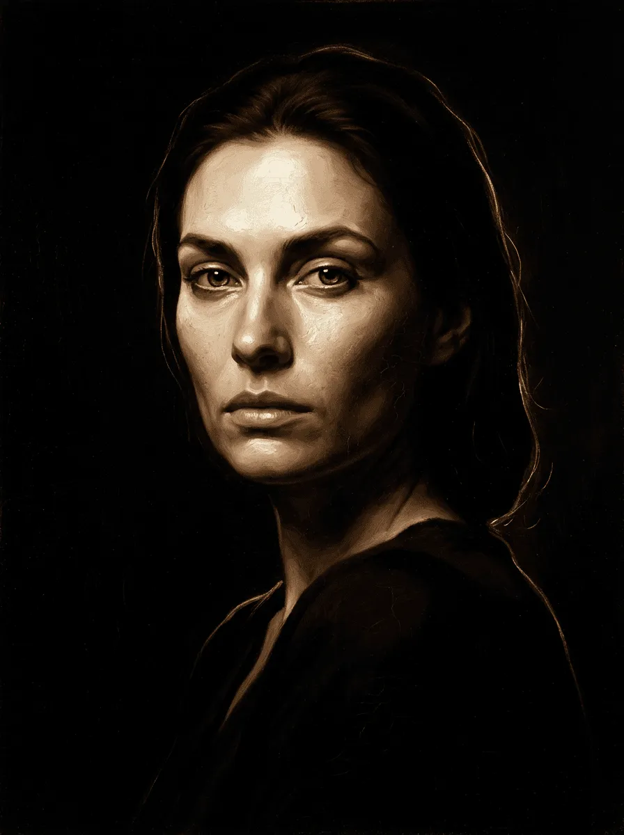 Rendered in rich oil paint with masterful light and shadow, this striking portrait captures contemplative intensity against a deep black background. The luminous skin tones and golden highlights create a timeless canvas print perfect for galleries, studies, or sophisticated living spaces.