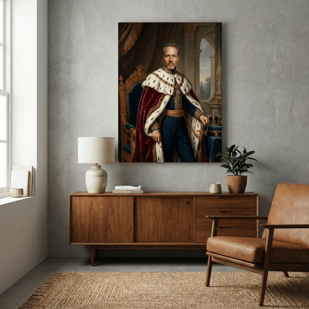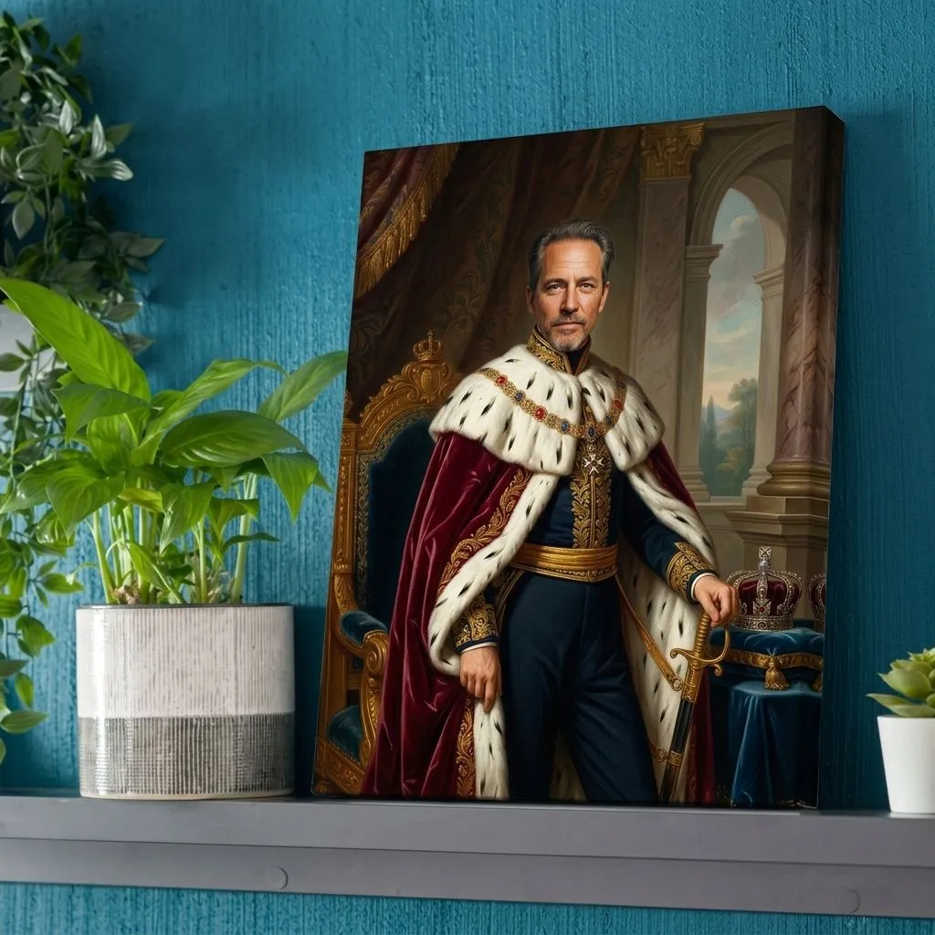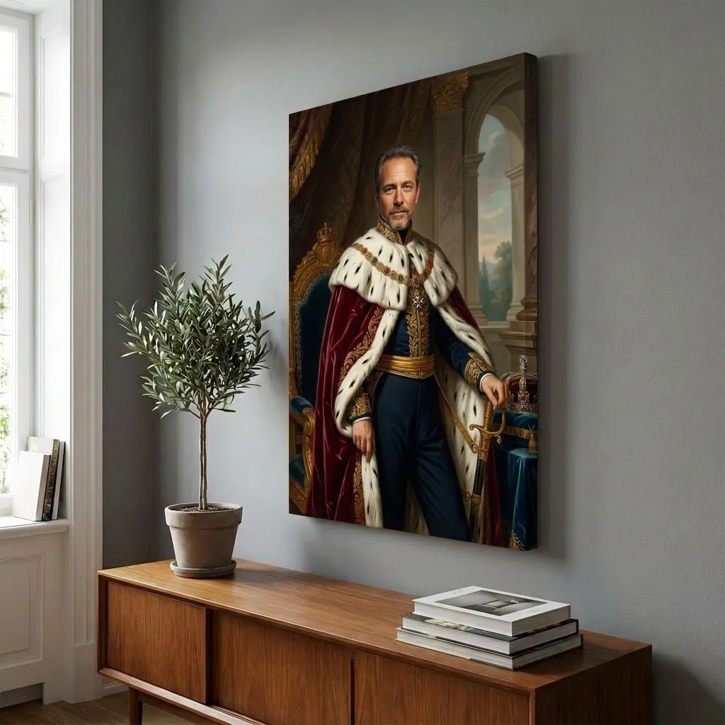 Rendered in classical oil painting technique with rich jewel tones and luminous gold accents, this regal portrait captures aristocratic grandeur. The meticulous detail of ermine fur, ornate embroidery, and palatial architecture creates a commanding canvas print perfect for executive offices or formal living spaces.