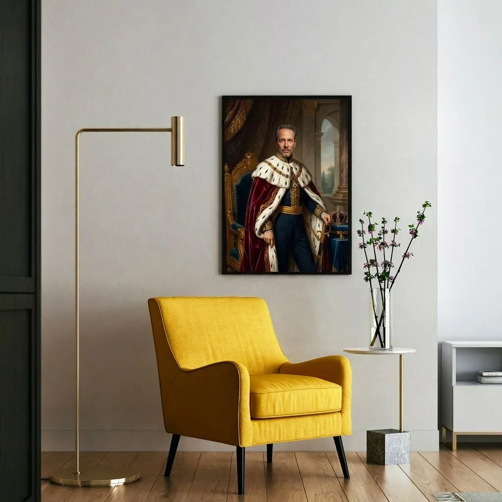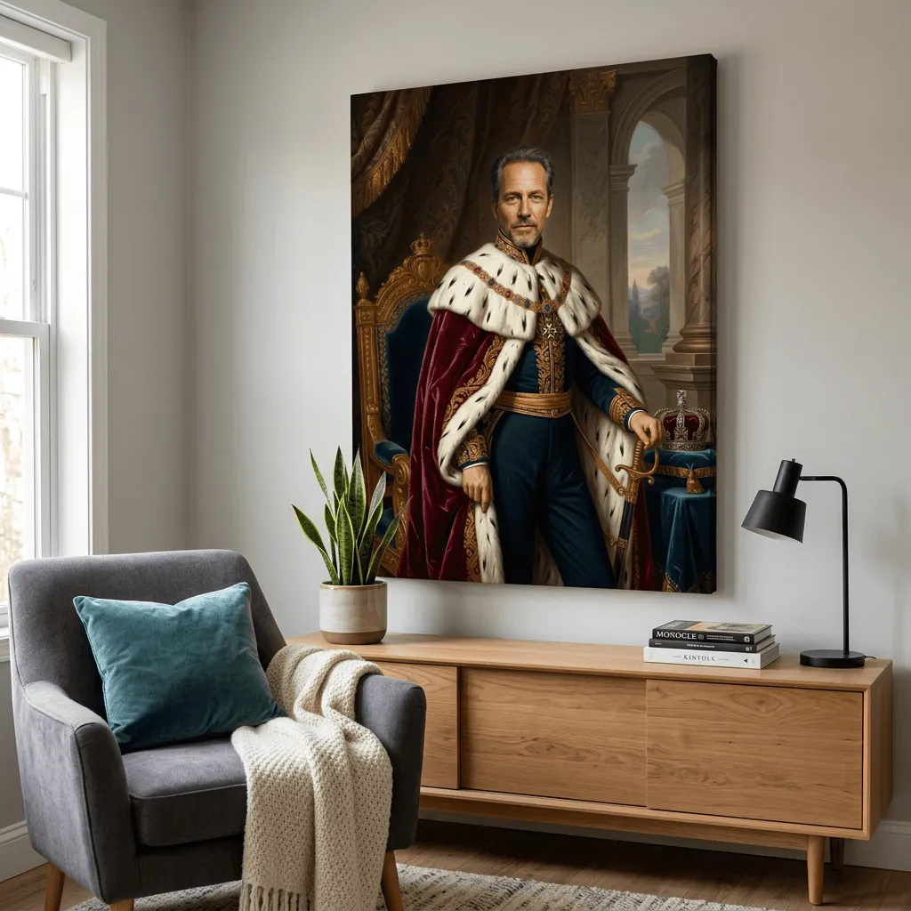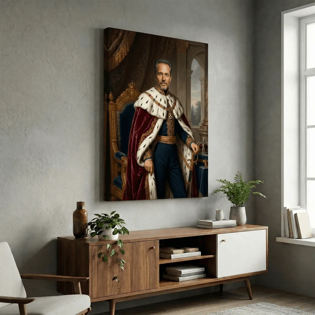Rendered in classical oil painting technique with rich jewel tones and luminous gold accents, this regal portrait captures aristocratic grandeur. The meticulous detail of ermine fur, ornate embroidery, and palatial architecture creates a commanding canvas print perfect for executive offices or formal living spaces.