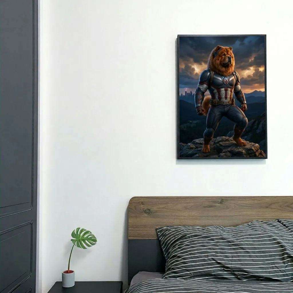 This striking futuristic 3D render features a heroic Chow Chow warrior in advanced tactical armor with star-emblazoned chest plate, set against a dramatic sunset mountain backdrop. A bold canvas print that brings fantasy adventure and personality to any room.