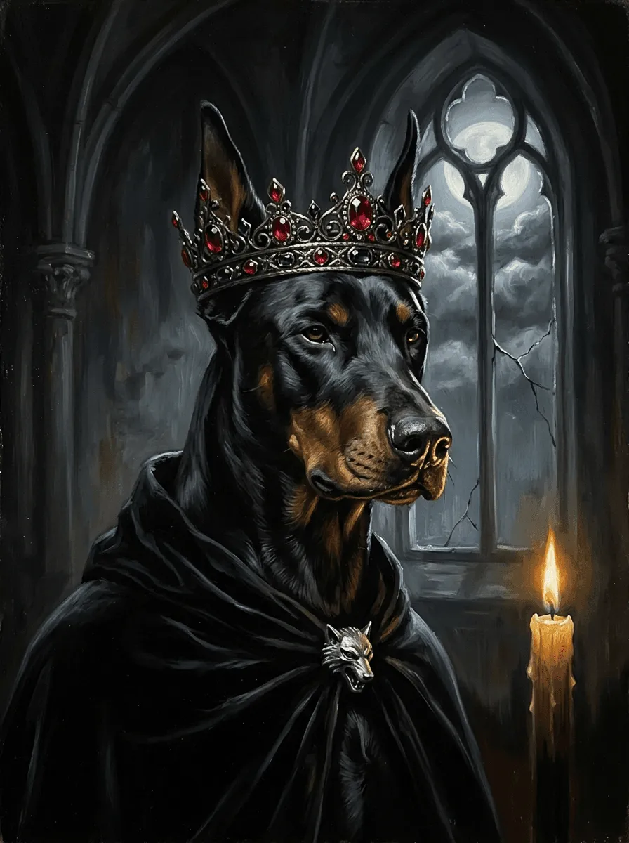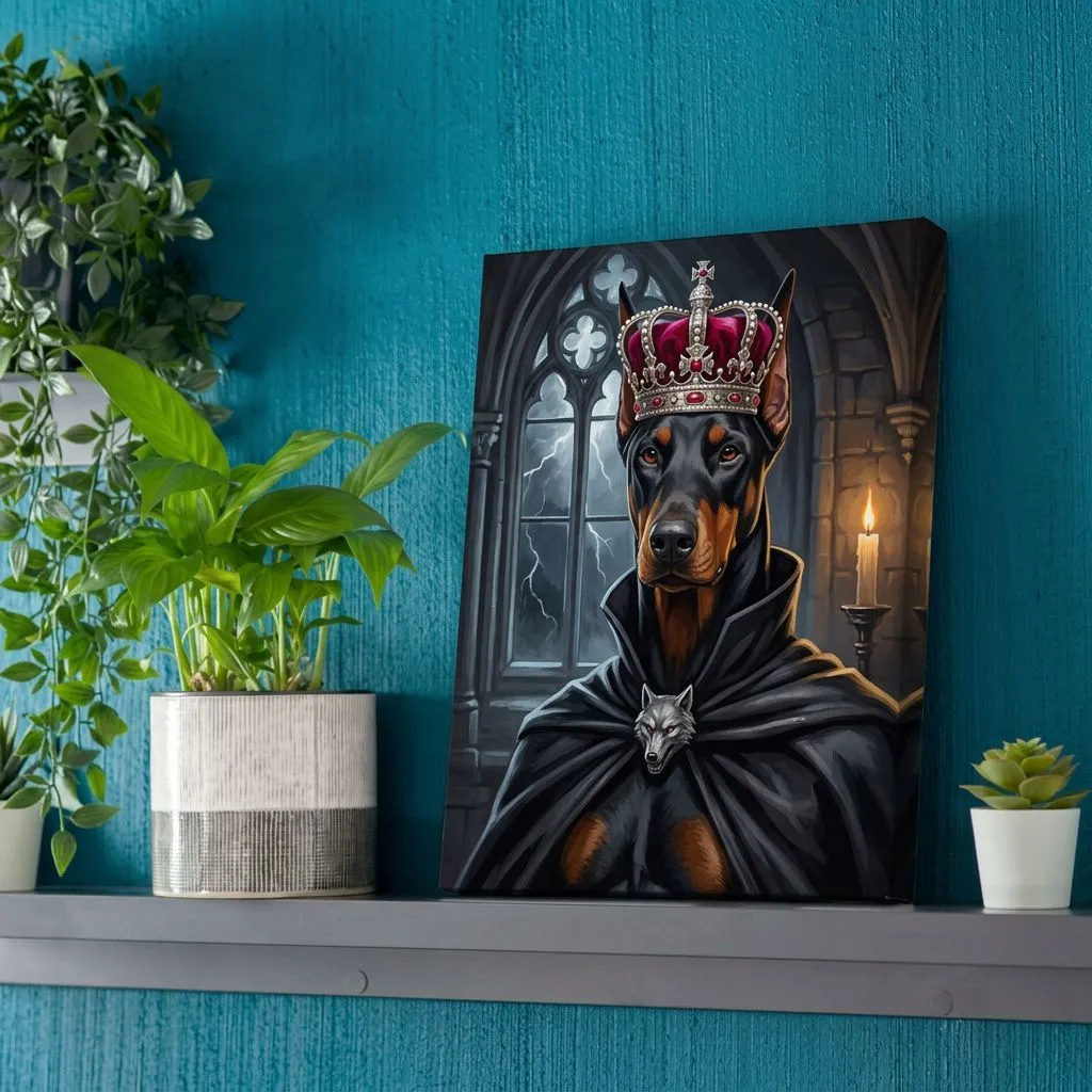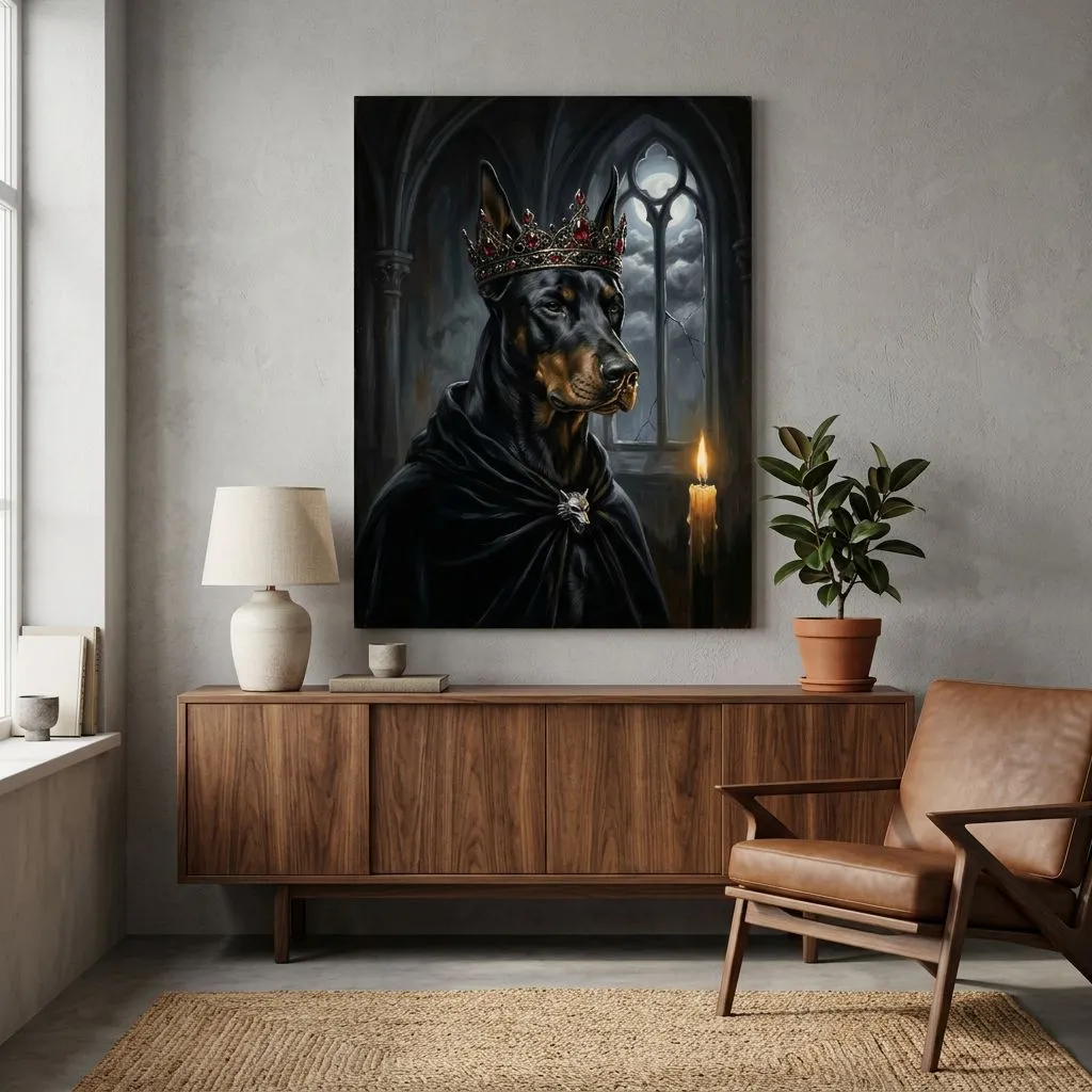 Rendered in rich oil paint with dramatic Gothic cathedral lighting, this striking portrait depicts a noble Doberman adorned with a jeweled crimson crown and black velvet cloak. A commanding canvas print that brings aristocratic elegance and dark fantasy atmosphere to any room.