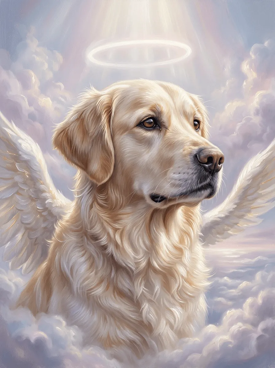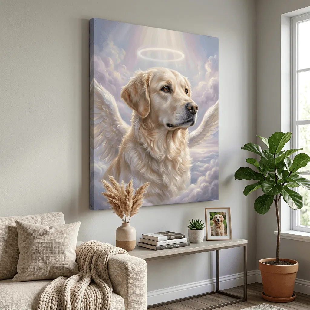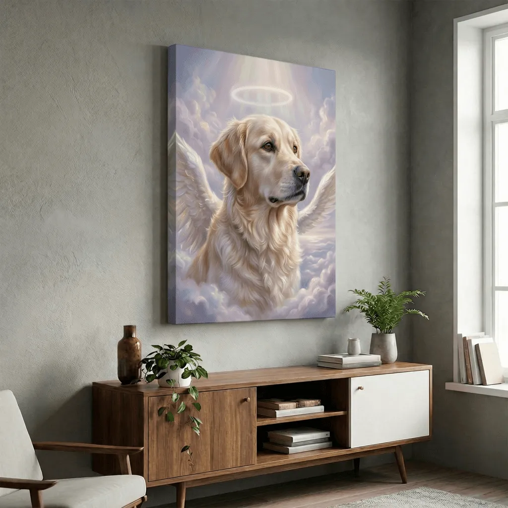 Rendered in realistic oil painting technique with luminous detail, this heavenly dog portrait features a golden-haired retriever with ethereal white wings and a glowing halo set against soft clouds. A touching canvas print perfect for pet lovers seeking meaningful home decor.