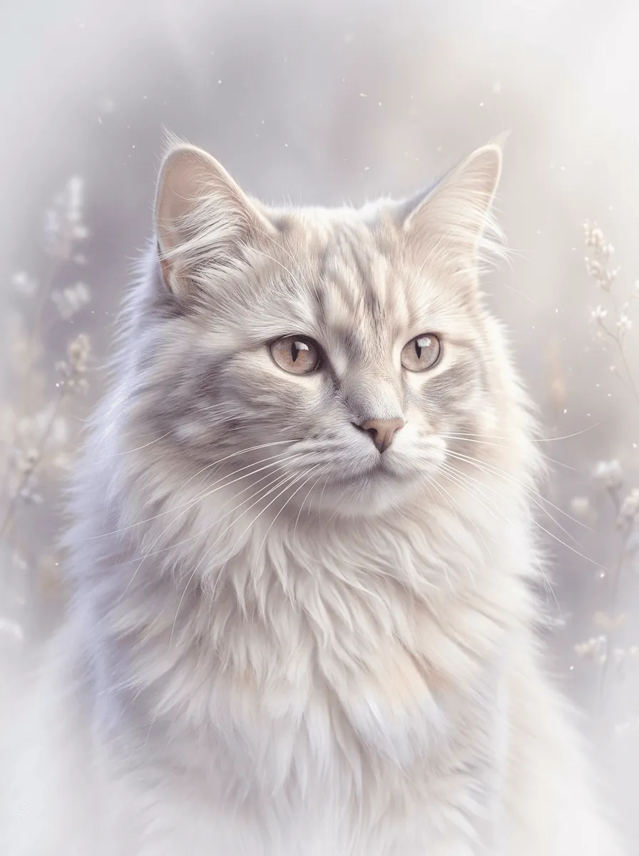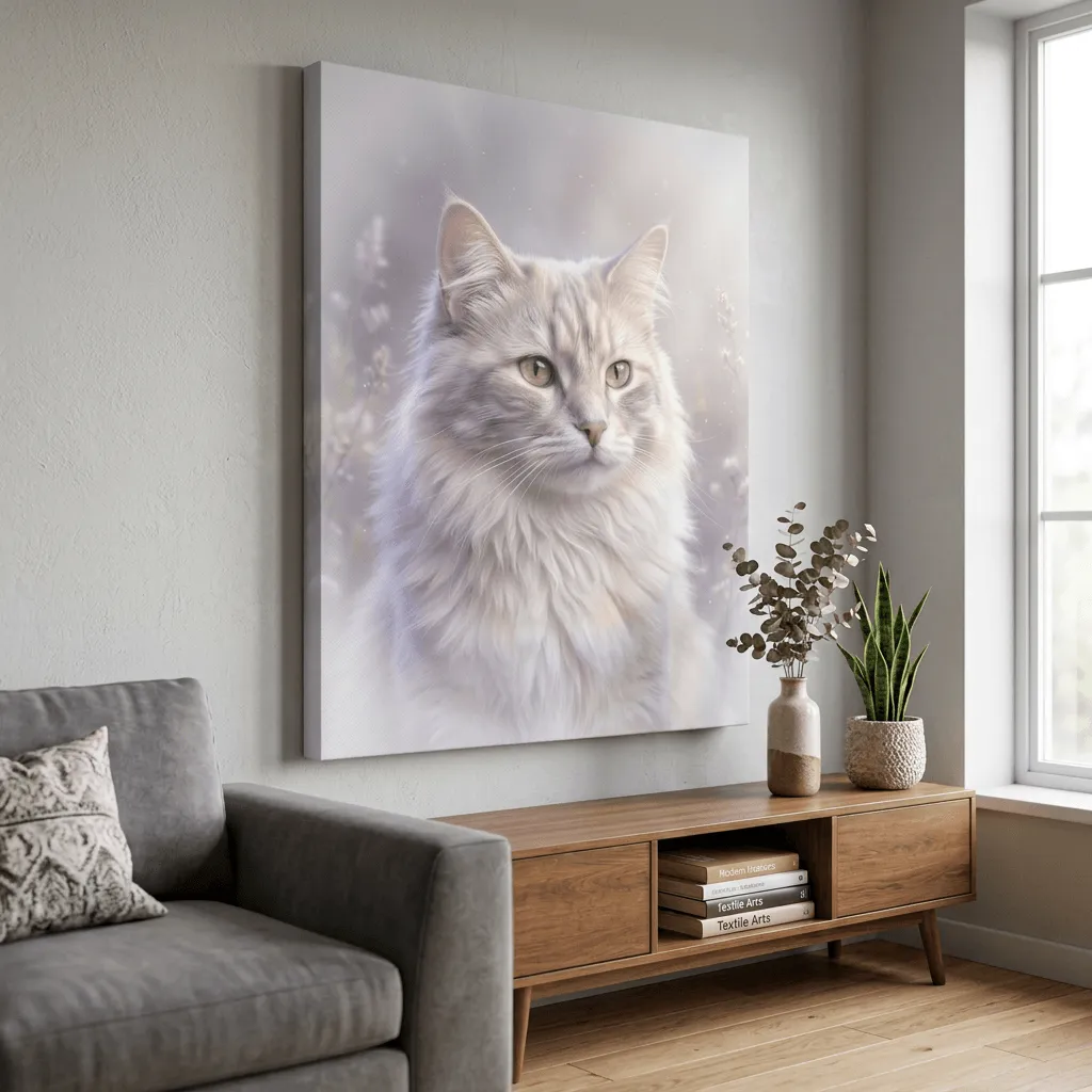 This striking realistic portrait captures a fluffy white cat with piercing golden eyes in stunning detail. Soft, luminous brushwork and delicate background bokeh create a serene, gallery-quality canvas print perfect for cat lovers and modern home decor.
