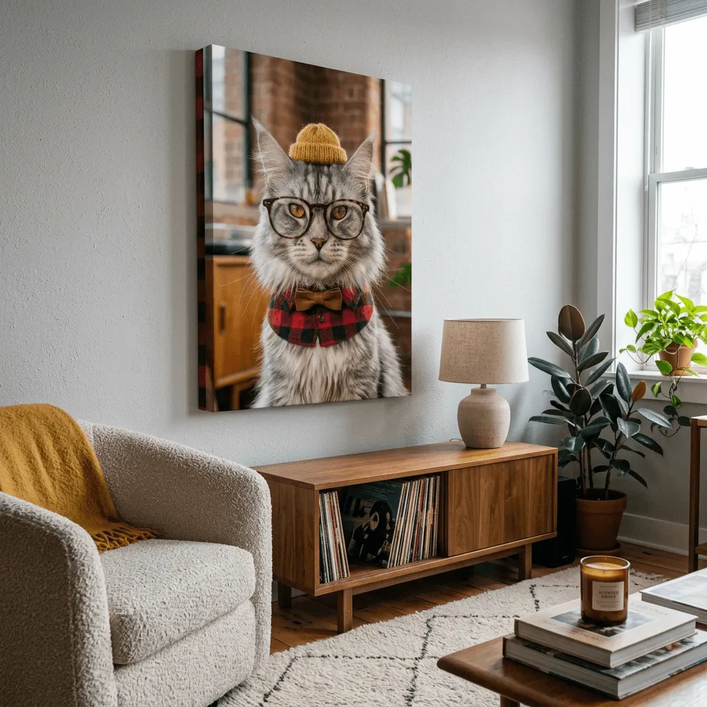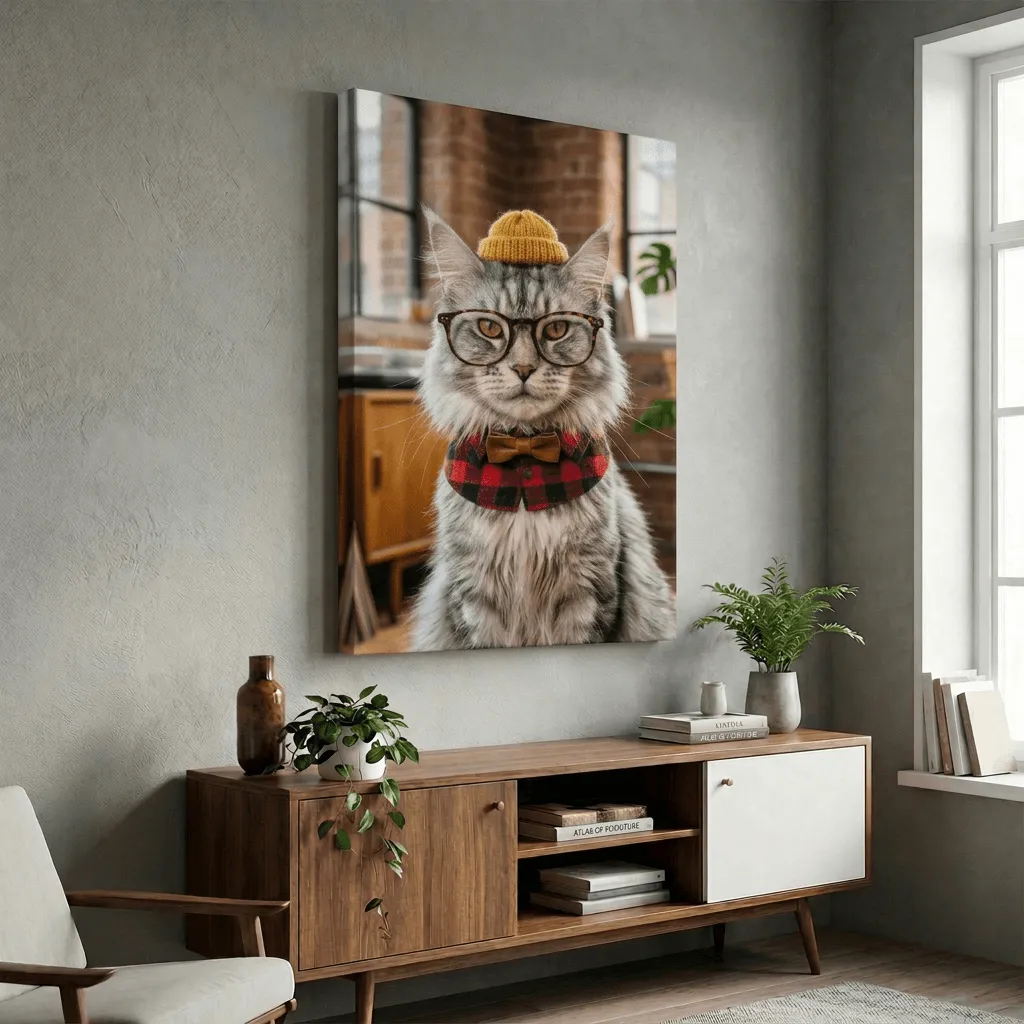 This striking realistic portrait captures a fluffy cat with personality in vintage glasses, a golden beanie, and plaid bow tie. Perfect as a humorous yet charming canvas print for cat lovers, bringing warmth and character to any room.
