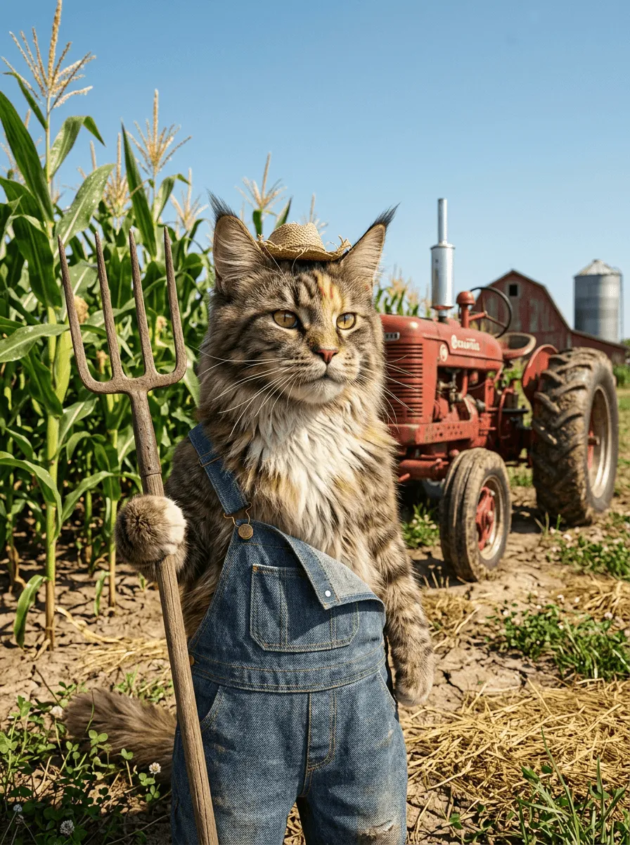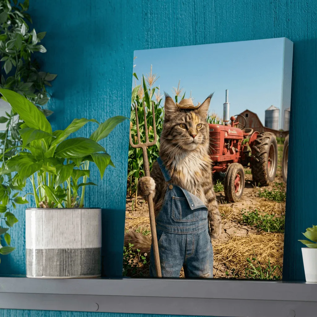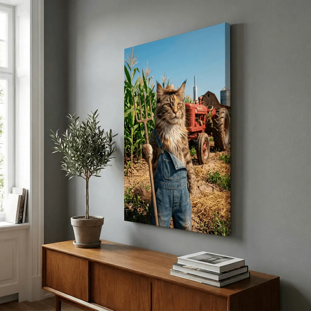Realistic portrait of a tabby cat farmer wearing denim overalls, straw hat, and holding a pitchfork in a rustic cornfield. Whimsical yet detailed canvas art perfect for adding personality and humor to any room.