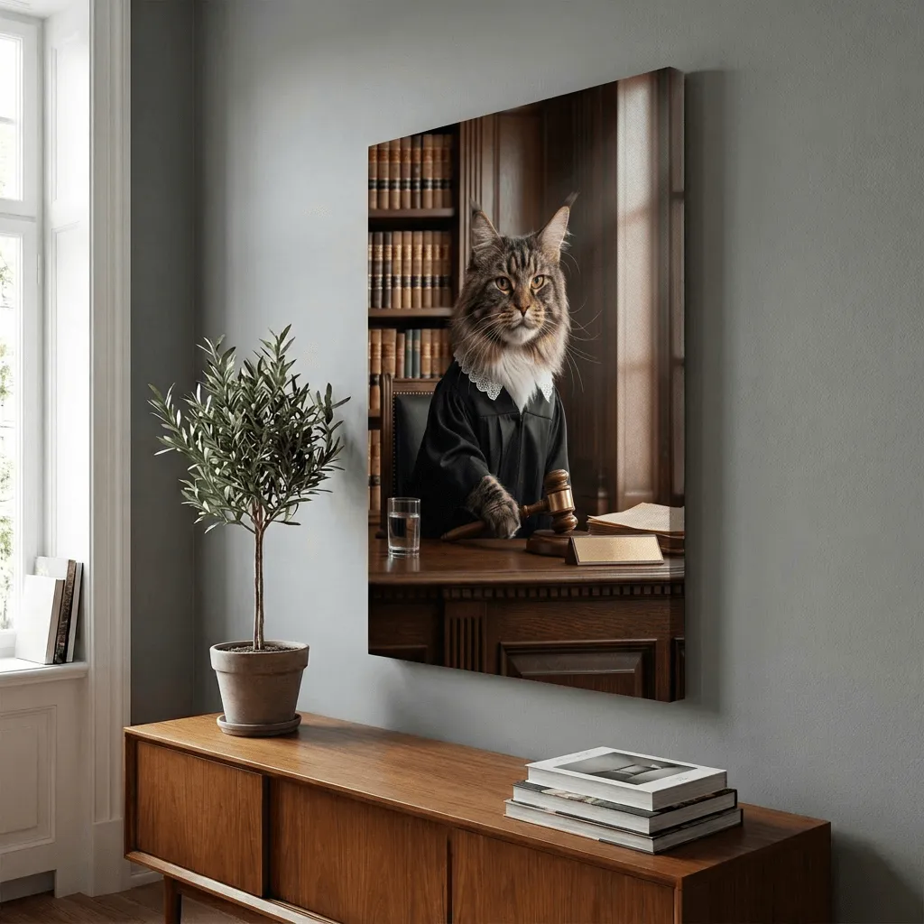 A strikingly realistic portrait of a dignified tabby cat dressed as a judge, complete with black robes and ornate lace collar. This whimsical canvas print brings humor and sophistication to any room, perfect for law offices, studies, or homes with a playful aesthetic.
