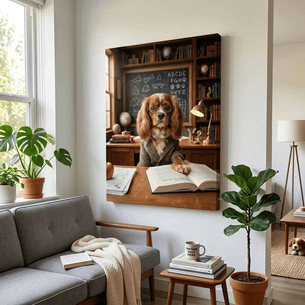 This striking realistic artwork captures a scholarly spaniel wearing wire-frame glasses in a cozy study setting. Rich detail and warm wood tones create an engaging canvas print that brings personality and charm to any room or office space.