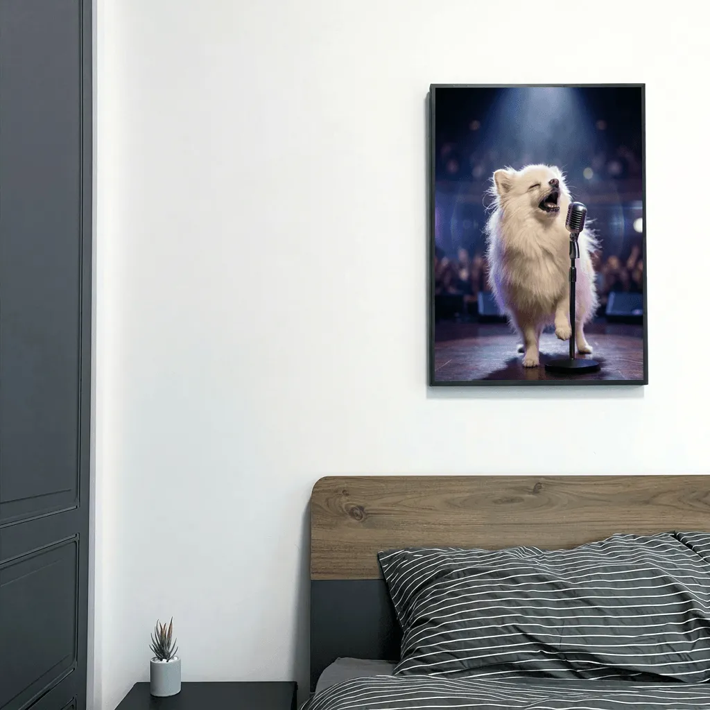 This striking realistic canvas print captures a charming white fluffy dog performing at a vintage microphone with expressive joy. Perfect wall art for music lovers and pet enthusiasts, bringing playful personality and contemporary charm to any room.
