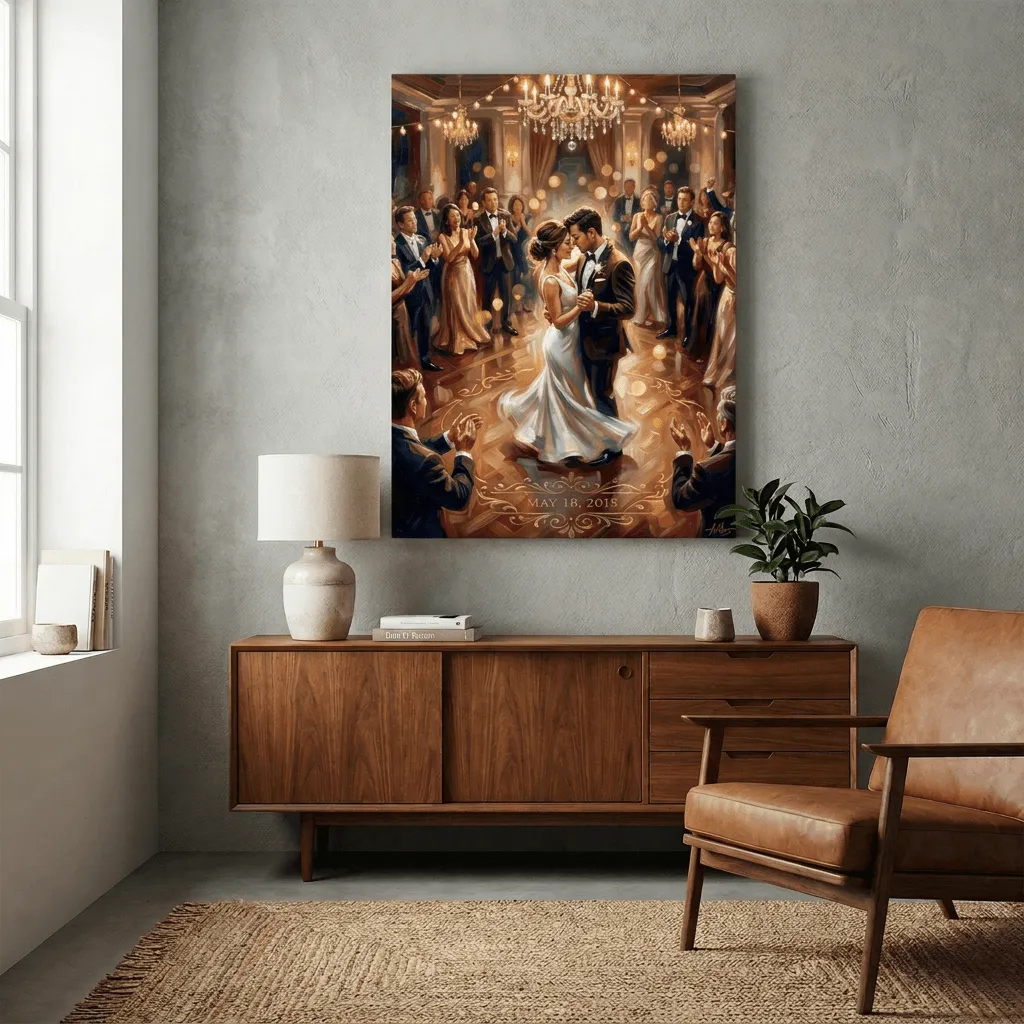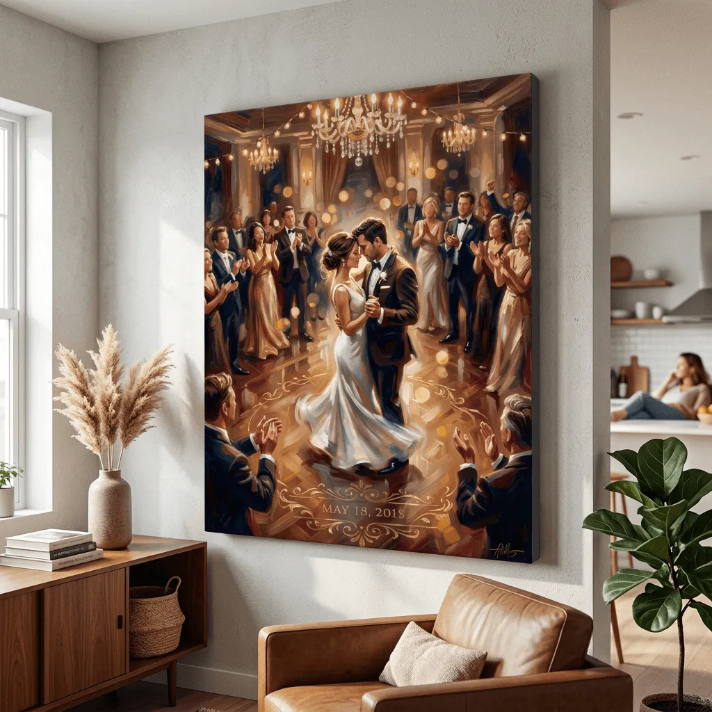 Rendered in rich oil paint textures with warm golden tones, this romantic wedding scene captures an elegant first dance beneath crystal chandeliers. A stunning canvas print that brings timeless sophistication and celebration to any bedroom or living room.