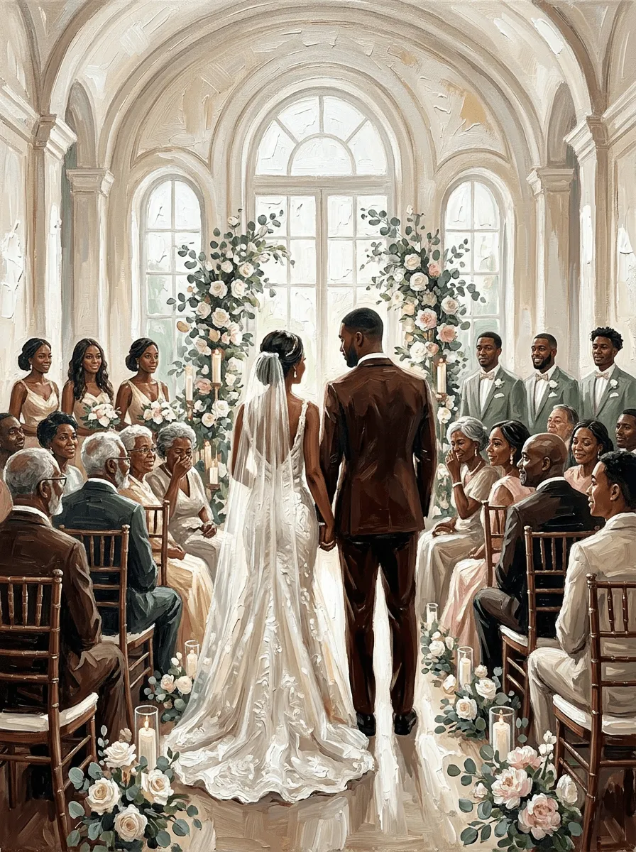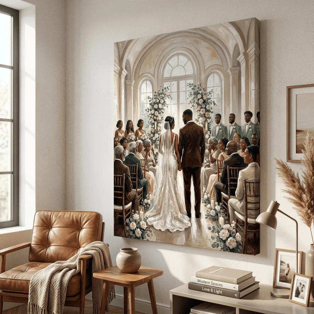 Rendered in rich oil paint with luminous brushwork, this elegant wedding scene captures a bride and groom exchanging vows beneath a soaring arched corridor. Soft ivory and gold tones, delicate floral arrangements, and natural light streaming through grand windows create a romantic, timeless canvas print perfect for bedrooms, living rooms, or as a cherished wedding gift.