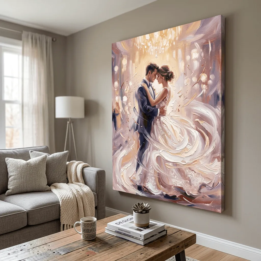 Rendered in rich oil paint with sweeping brushstrokes and luminous warm tones, this romantic wedding portrait captures an elegant couple dancing in an ornate venue. The flowing gown and soft golden lighting create a timeless canvas print perfect for bedrooms, living rooms, or as a cherished wedding gift.