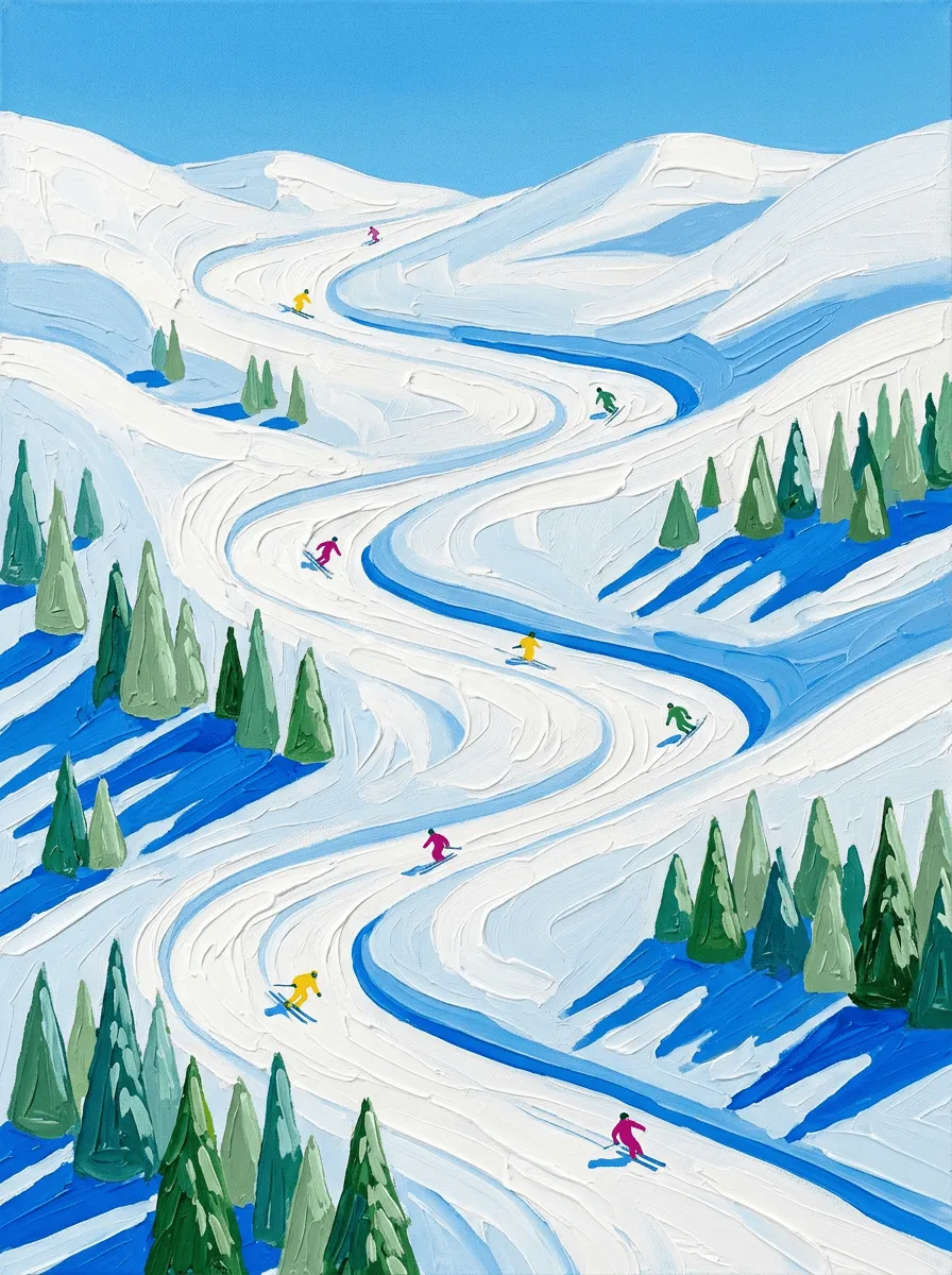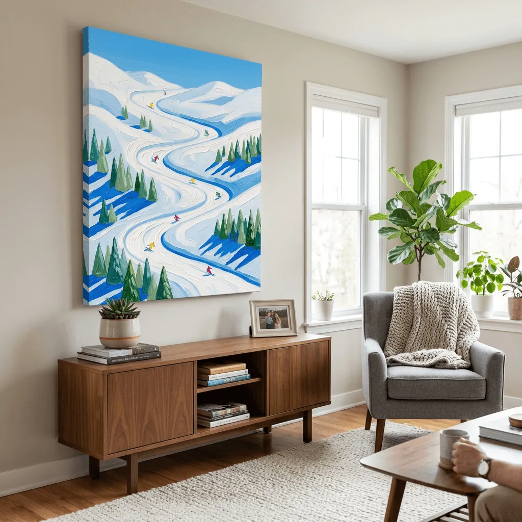 Rendered in bold acrylic paint with sweeping brushstrokes, this vibrant winter landscape captures multiple skiers navigating pristine snowy slopes. Bright blues and whites create dynamic energy perfect for any living room or office seeking adventure-inspired wall art.