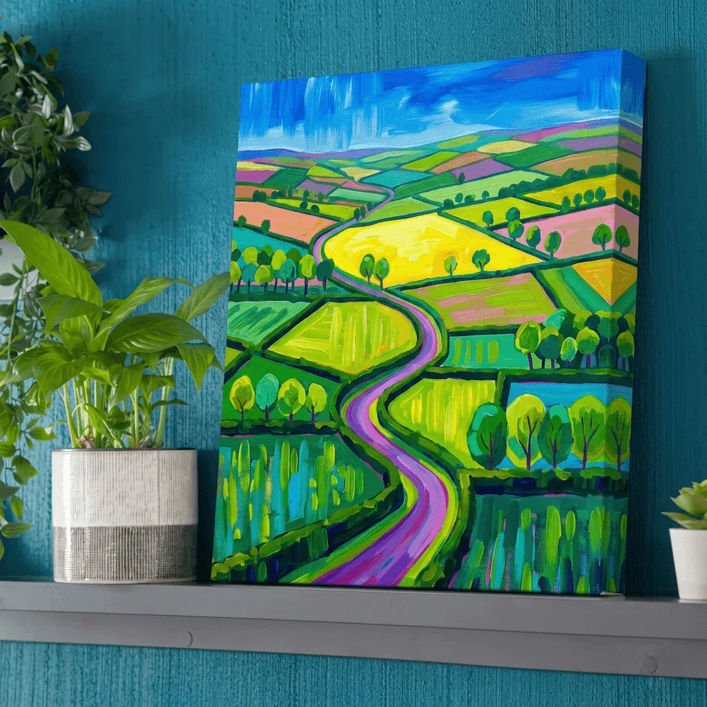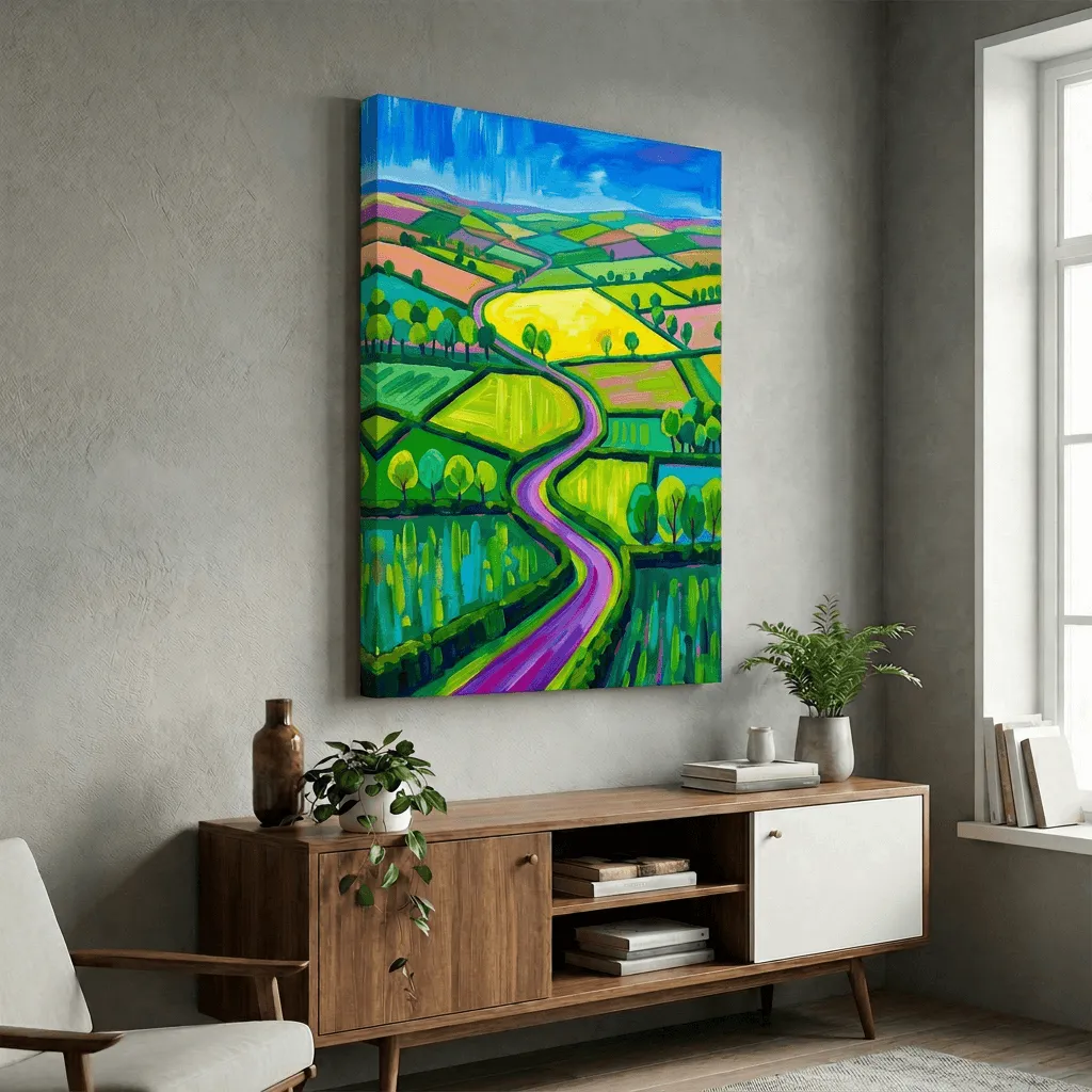 Bold acrylic brushstrokes and neon color blocking create this striking contemporary landscape. Vivid yellows, magentas, and lime greens define rolling fields and winding rivers, perfect for adding energetic modern flair to any room.