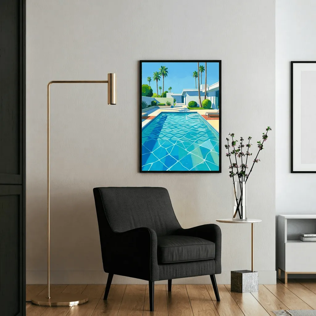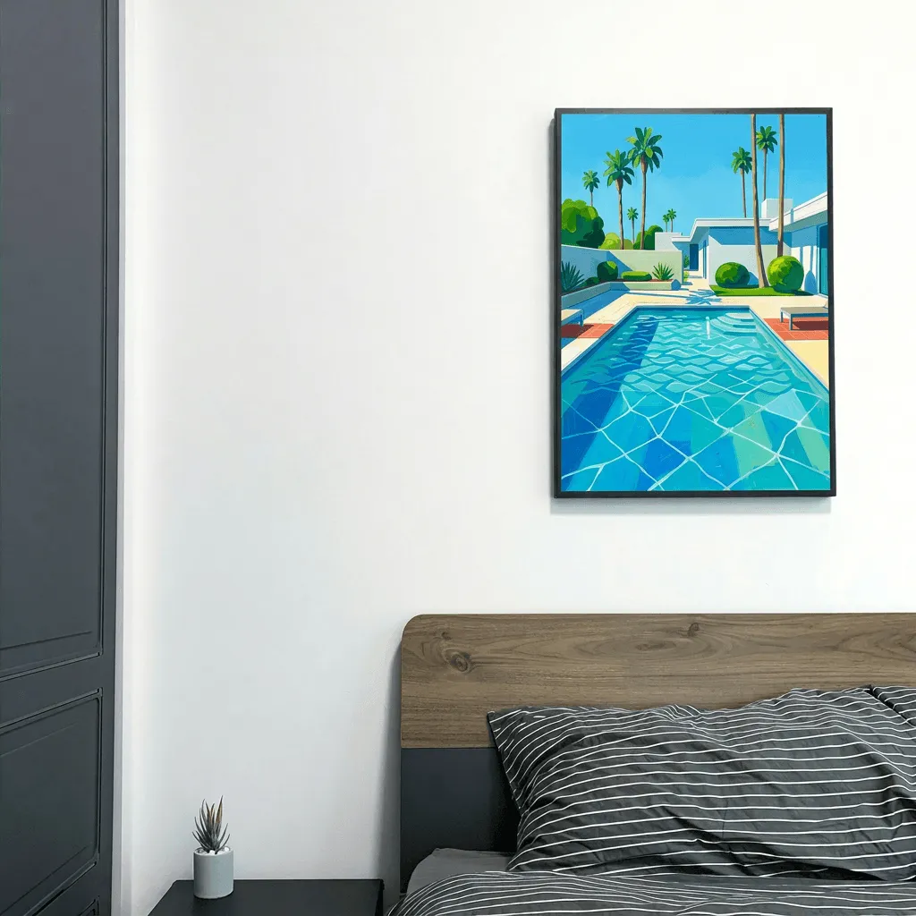 Rendered in vibrant acrylic with bold geometric patterns and striking turquoise tones, this contemporary poolside scene brings tropical luxury to any space. Perfect canvas print for creating a resort-inspired atmosphere in living rooms, bedrooms, or home offices.