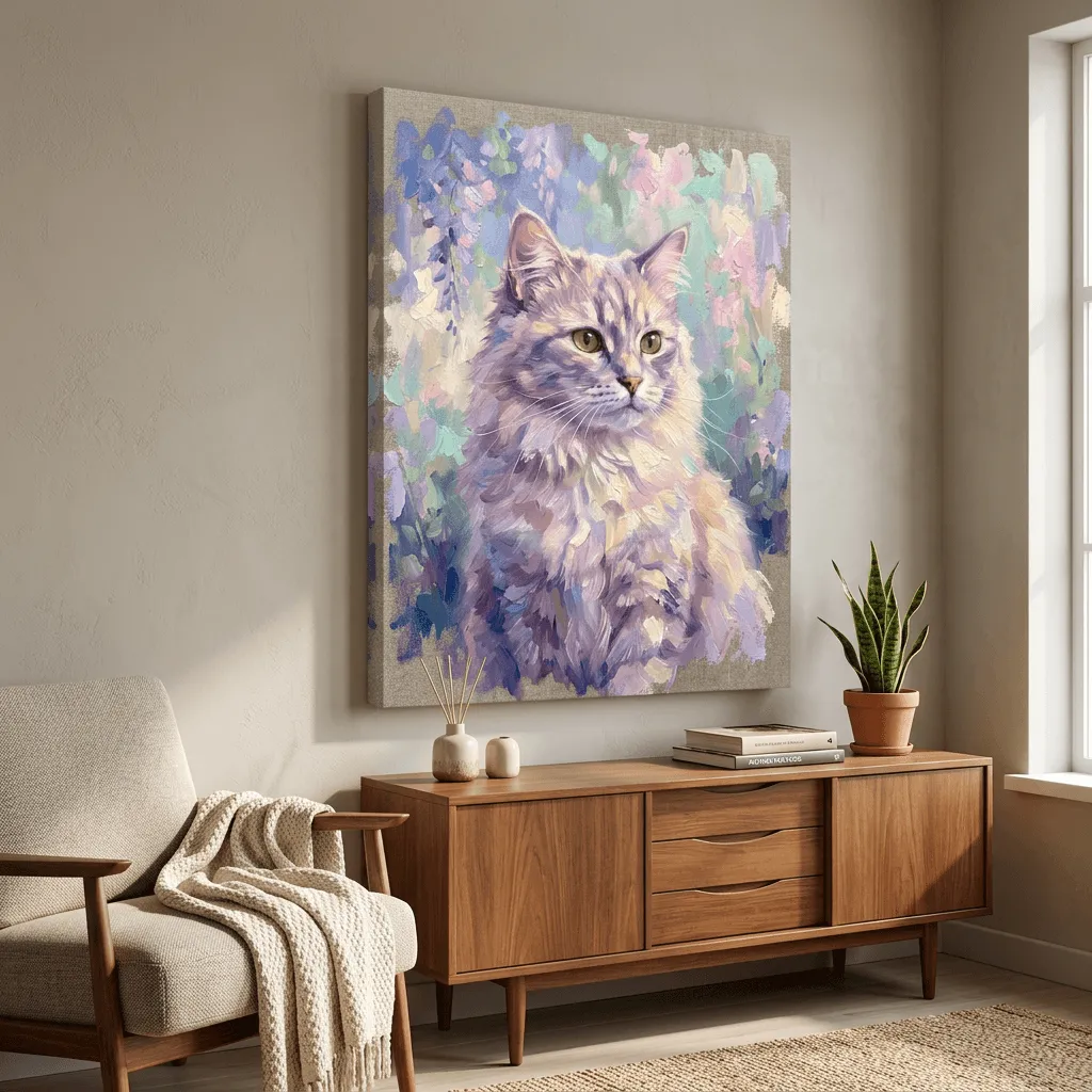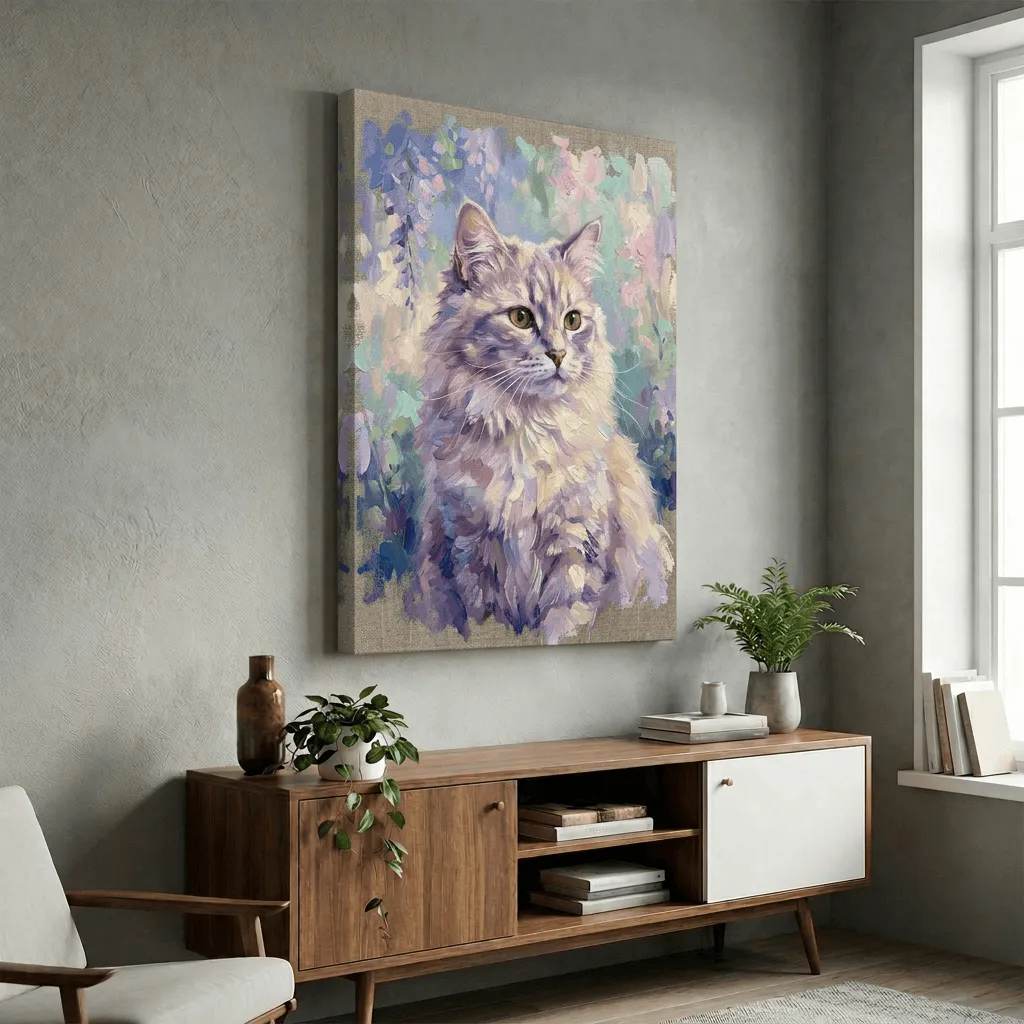 Rendered in rich oil paint with expressive brushstrokes, this striking cat portrait features soft lavender and pastel floral tones. Blooming wisteria vines frame the subject's piercing gaze, creating an enchanting canvas print perfect for pet lovers and nature-inspired home decor.