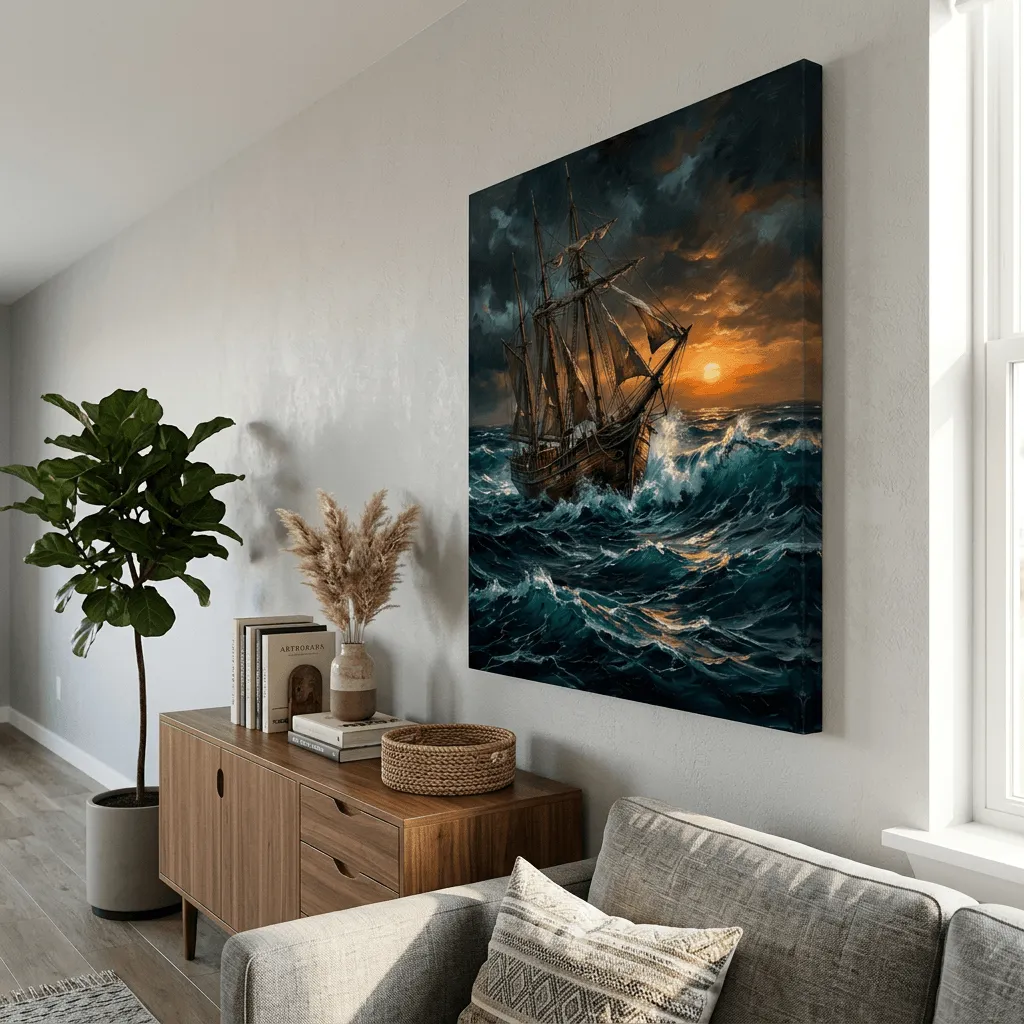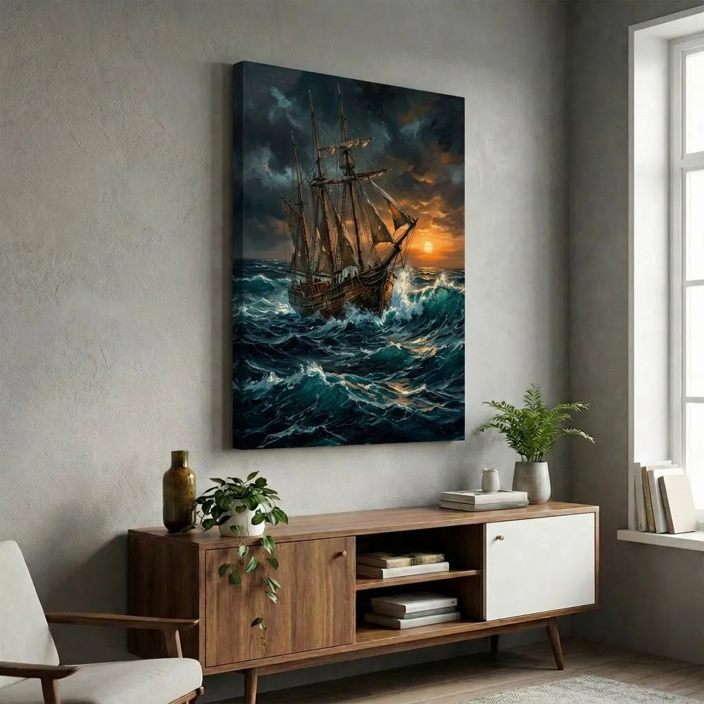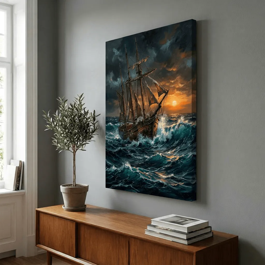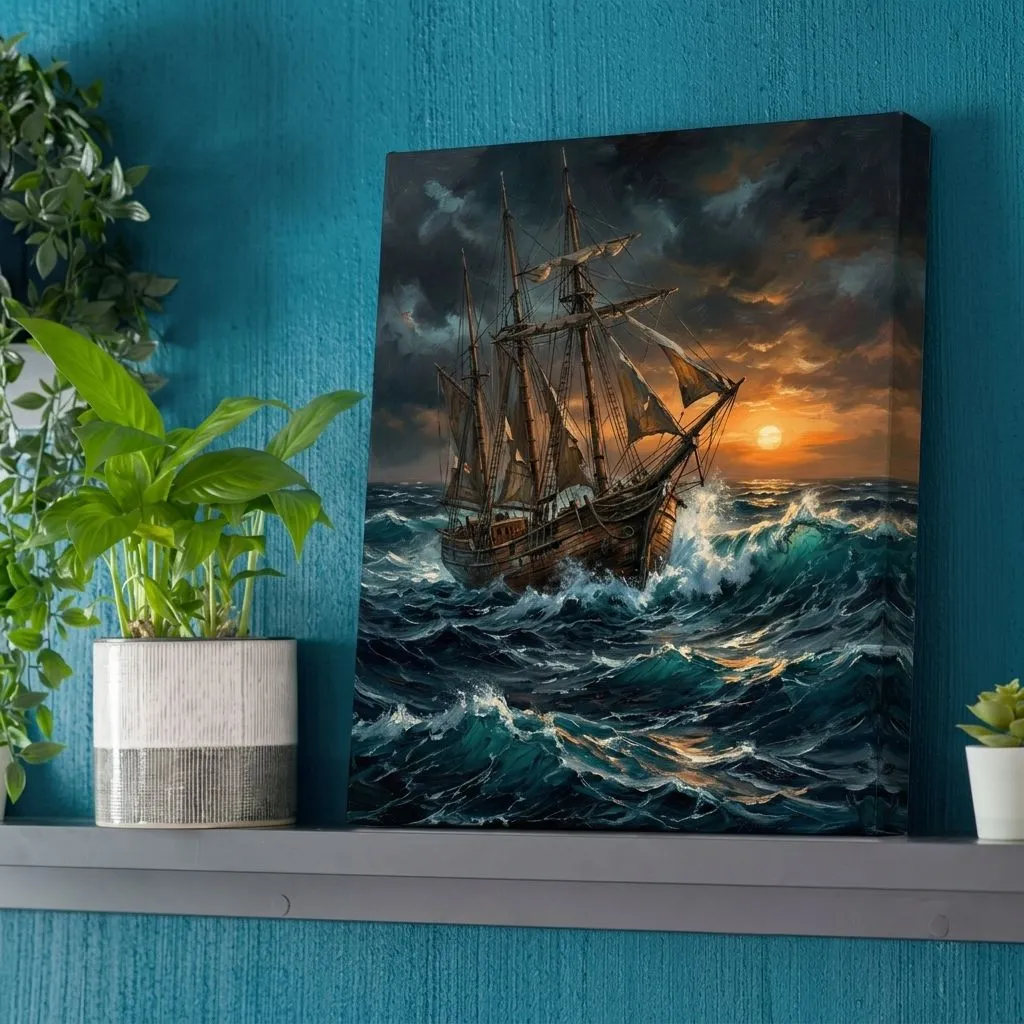 This dramatic oil painting captures a majestic galleon battling turbulent waves beneath a golden sunset. Rich textures and warm amber light contrast with deep teal and charcoal tones, creating a powerful maritime canvas print perfect for adding adventure and timeless elegance to any room.