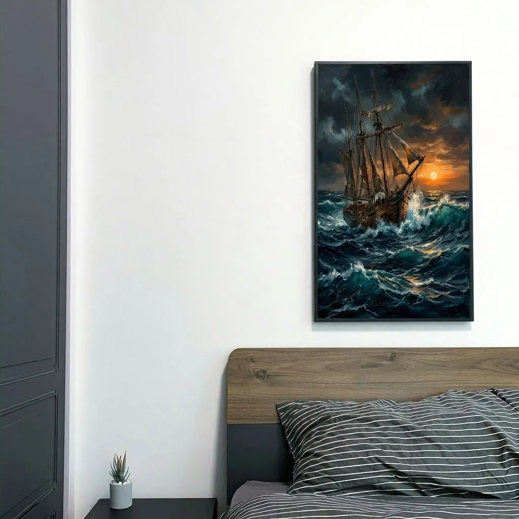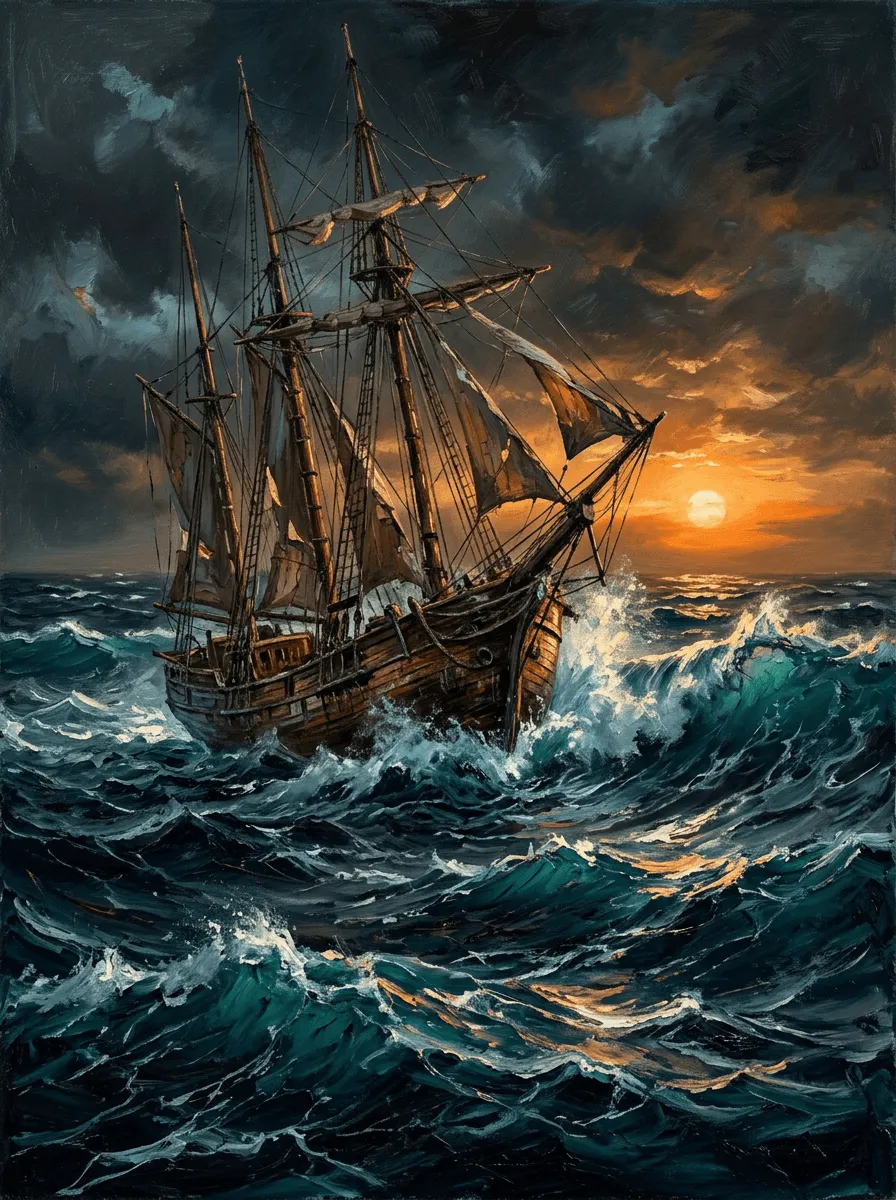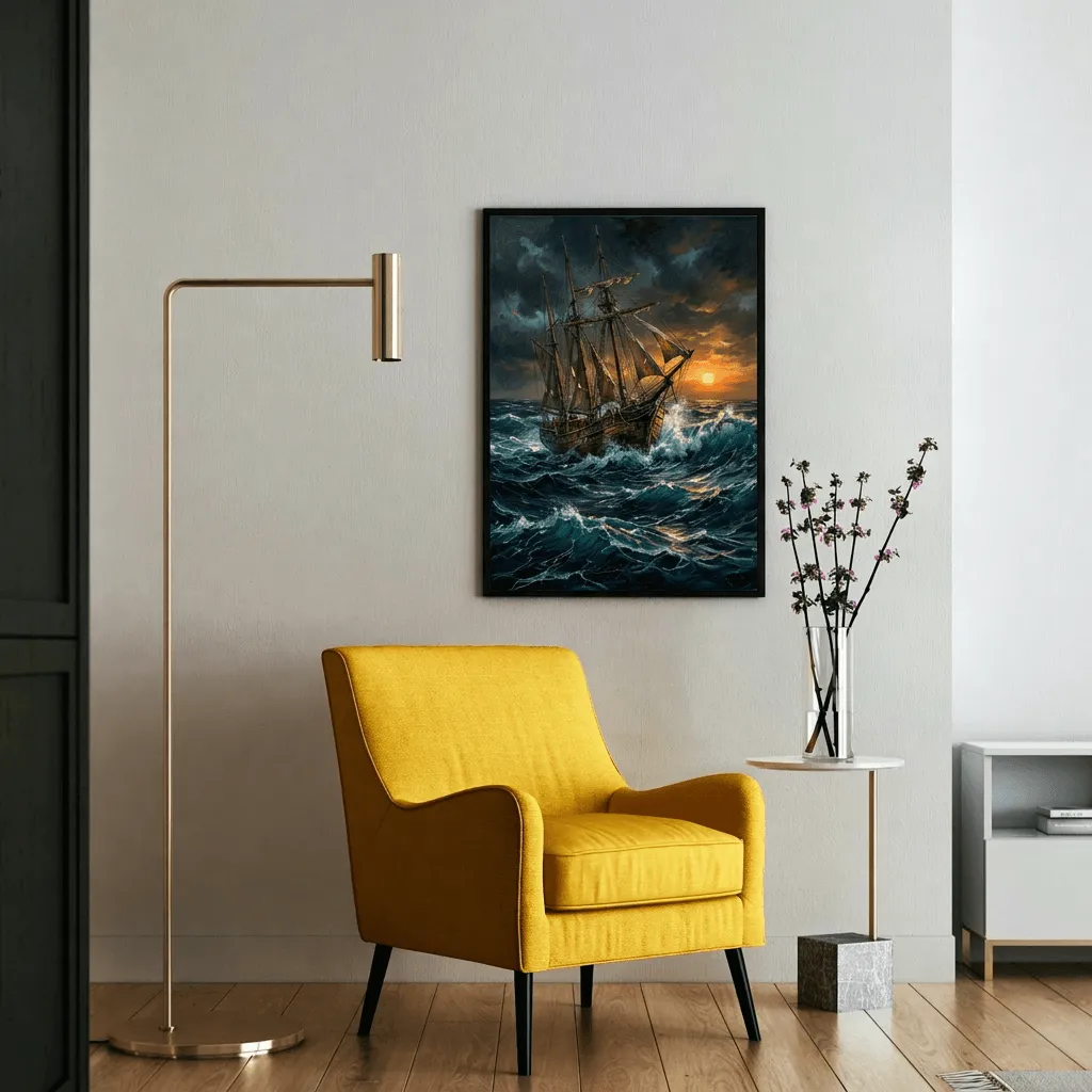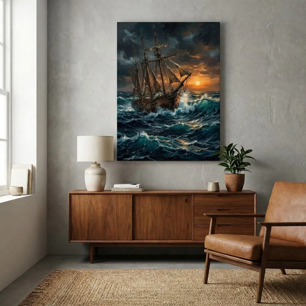 This dramatic oil painting captures a majestic galleon battling turbulent waves beneath a golden sunset. Rich textures and warm amber light contrast with deep teal and charcoal tones, creating a powerful maritime canvas print perfect for adding adventure and timeless elegance to any room.