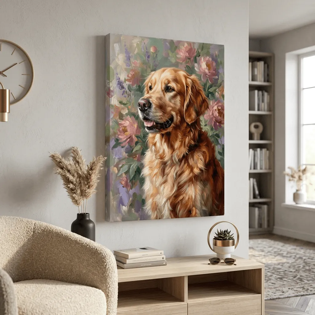 Rendered in rich oil paint textures, this striking portrait captures a golden retriever's gentle expression against a blooming floral garden backdrop. Warm amber and cream tones bring depth and warmth to this elegant canvas print, perfect for pet lovers seeking sophisticated wall art.