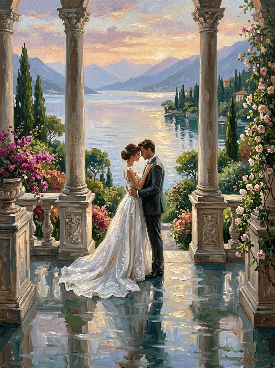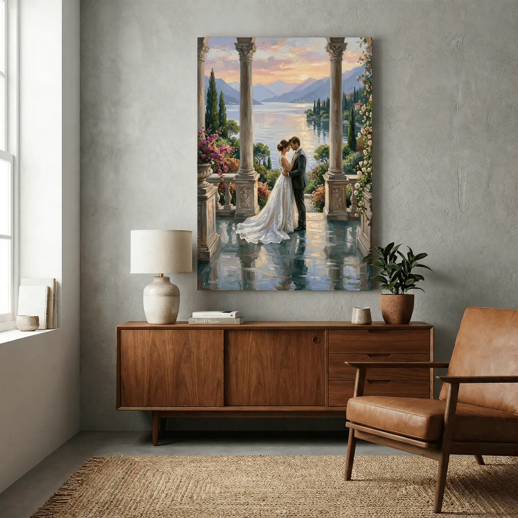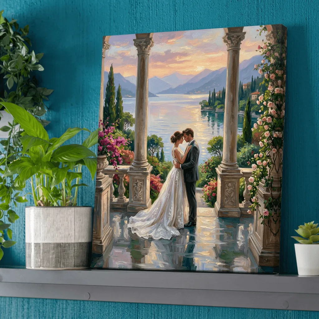 Rendered in rich oil paint textures with warm golden light and soft brushstrokes, this romantic wedding scene captures an intimate moment between bride and groom beneath classical columns overlooking a serene alpine lake. A stunning canvas print that brings timeless elegance and emotional depth to any room.