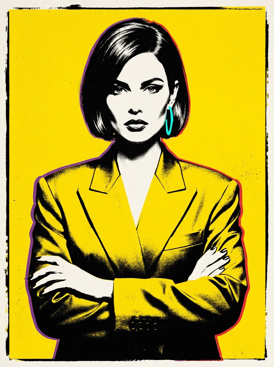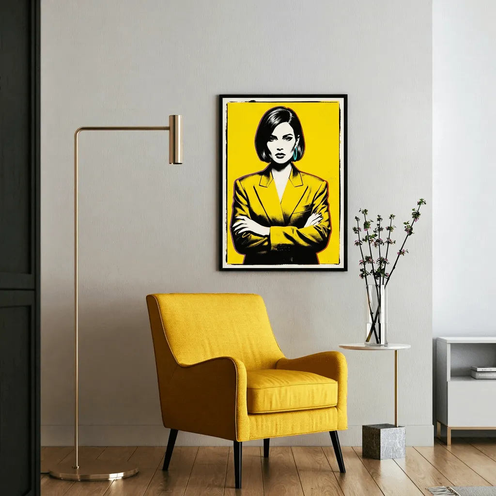 A striking pop art portrait rendered in bold yellow and black with vibrant neon accents. This high-contrast canvas print features a confident figure in a structured blazer against a luminous background, perfect for modern living spaces and contemporary home decor.