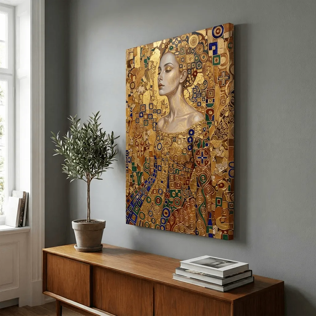 This striking digital art piece combines luxurious gold leaf textures with intricate mosaic patterns, creating a mesmerizing profile portrait. Rich jewel tones and ornamental details make this canvas print a sophisticated statement piece for any gallery wall or modern living space.