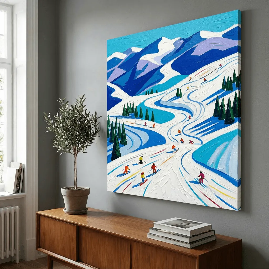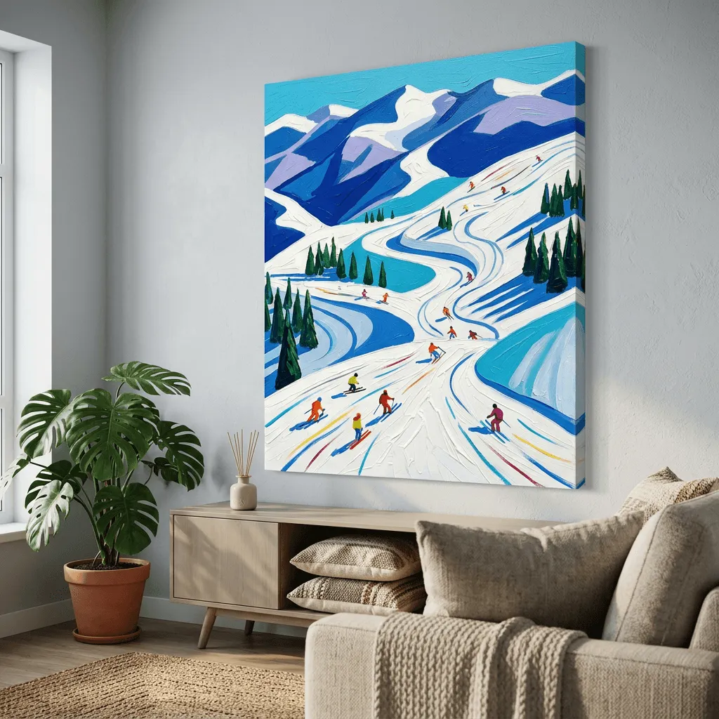Rendered in rich oil paint with bold brushstrokes and vibrant blues, this striking landscape captures a snowy mountain ski resort alive with colorful skiers. A dynamic canvas print that brings winter energy and alpine beauty to any room.