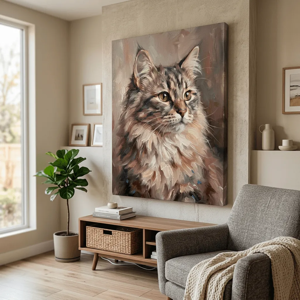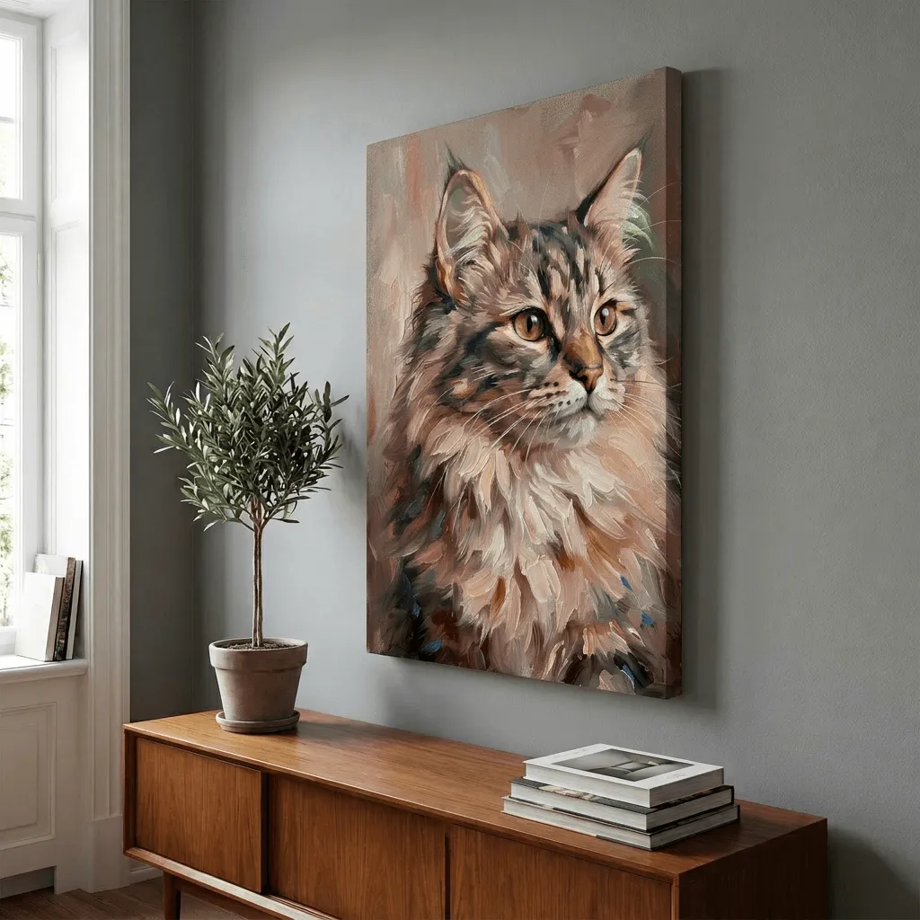 Rendered in rich oil paint textures with warm earth tones and expressive brushwork, this striking cat portrait captures the personality of a fluffy feline with piercing golden eyes. A captivating canvas print that brings warmth and character to any room.