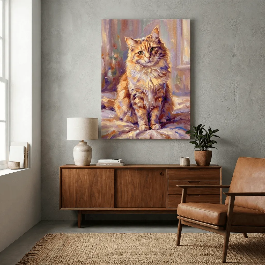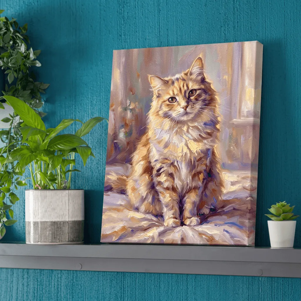 Rendered in rich oil paint textures with warm golden and purple tones, this striking cat portrait captures expressive feline eyes and luxurious fur detail. A captivating canvas print that brings warmth and personality to any room.