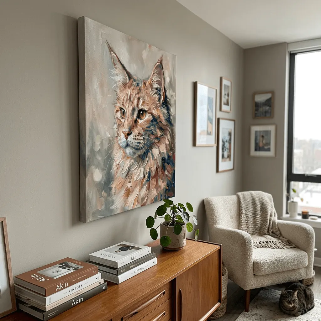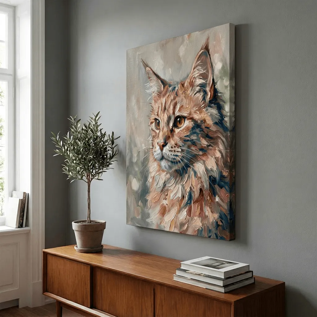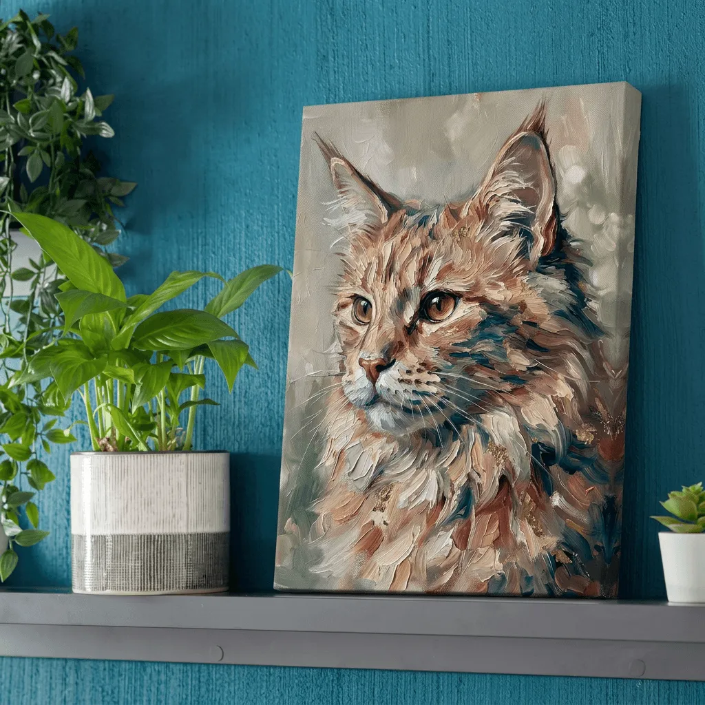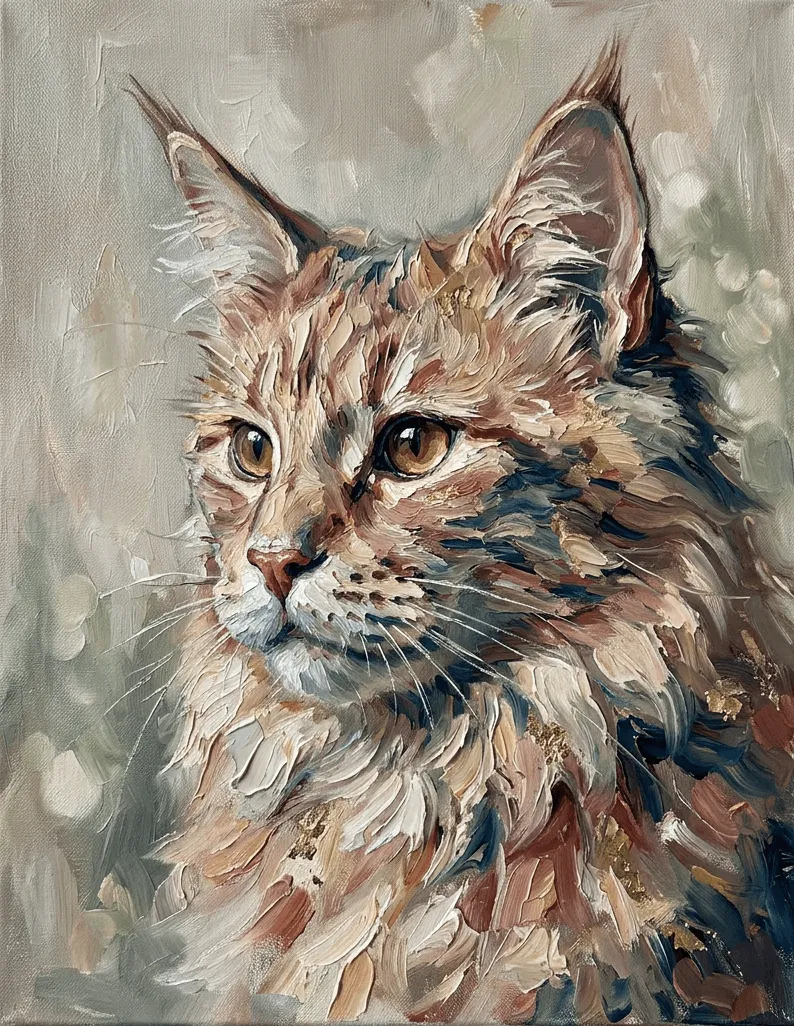 Rendered in rich oil paint with expressive brushstrokes, this striking tabby cat portrait captures warmth and personality through golden amber eyes and luxurious fur textures. A captivating canvas print that brings artistic elegance to any room.