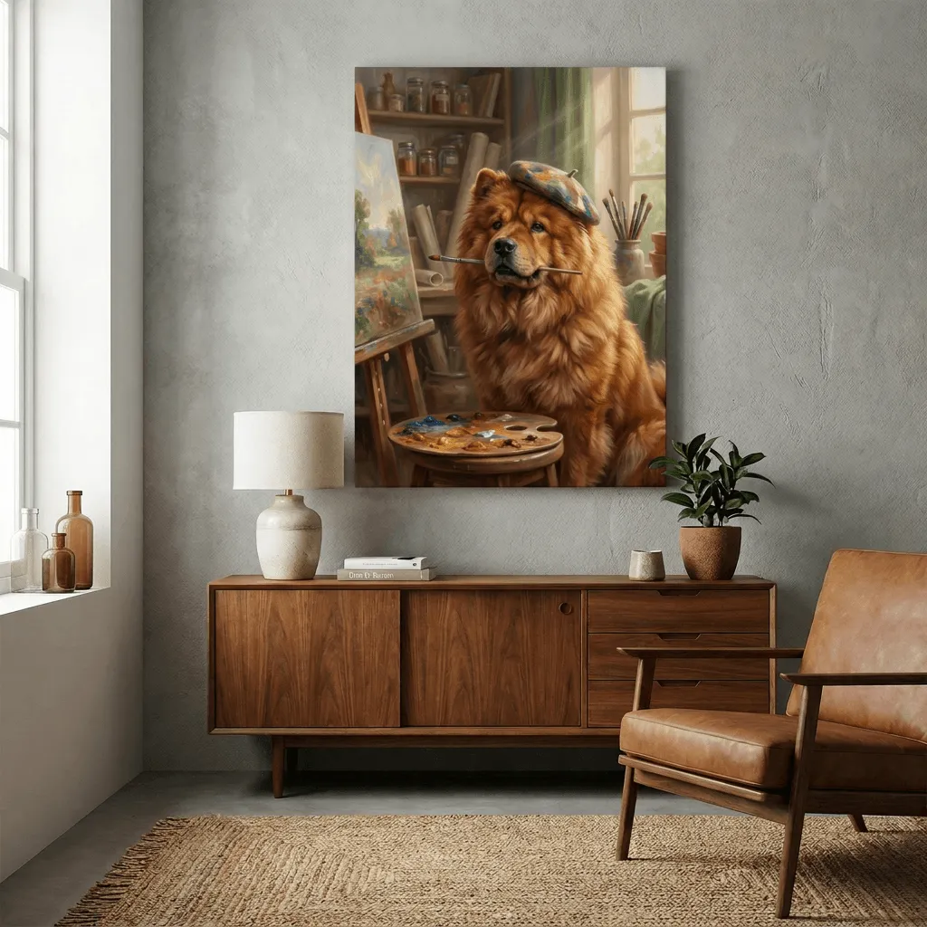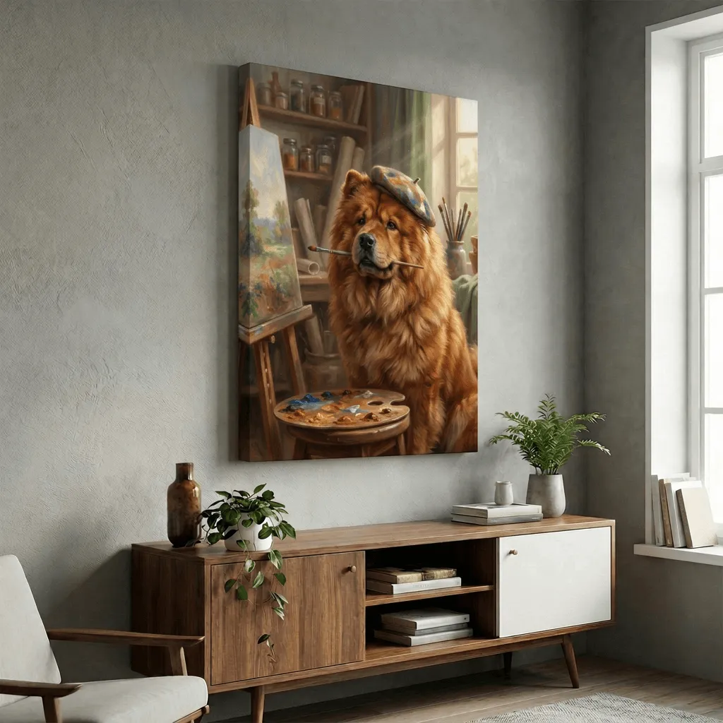 Rendered in rich oil paint textures with warm golden tones, this whimsical portrait captures a creative canine in an artist's studio. A charming canvas print that brings personality and artistic flair to any room.