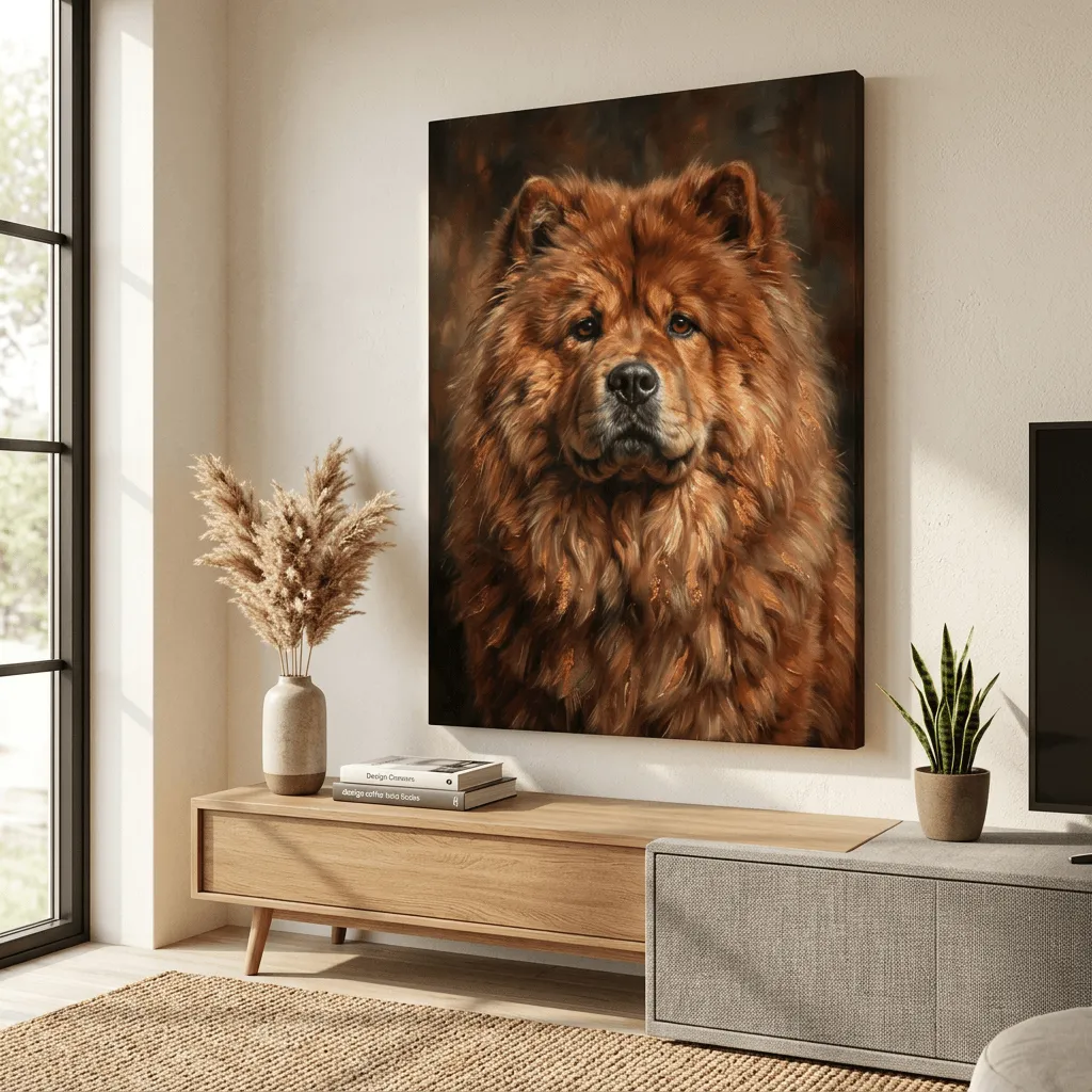 Rendered in rich oil paint textures with warm amber and golden tones, this striking chow chow portrait captures the breed's dignified expression and luxurious coat. A captivating canvas print that brings warmth and character to any living space.