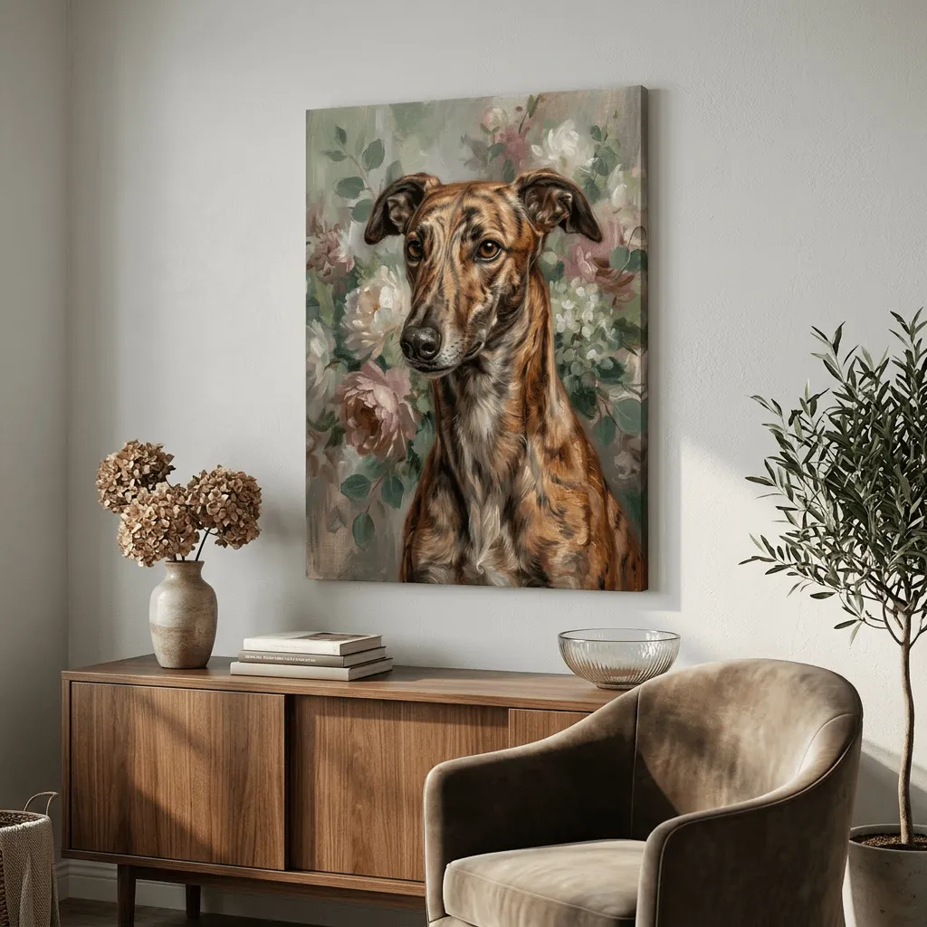 Rendered in rich oil paint textures with warm amber and cream tones, this striking dog portrait blooms against a lush backdrop of pink peonies and white flowers. A sophisticated canvas print that brings elegance and personality to any living room or study.