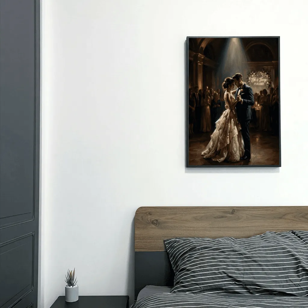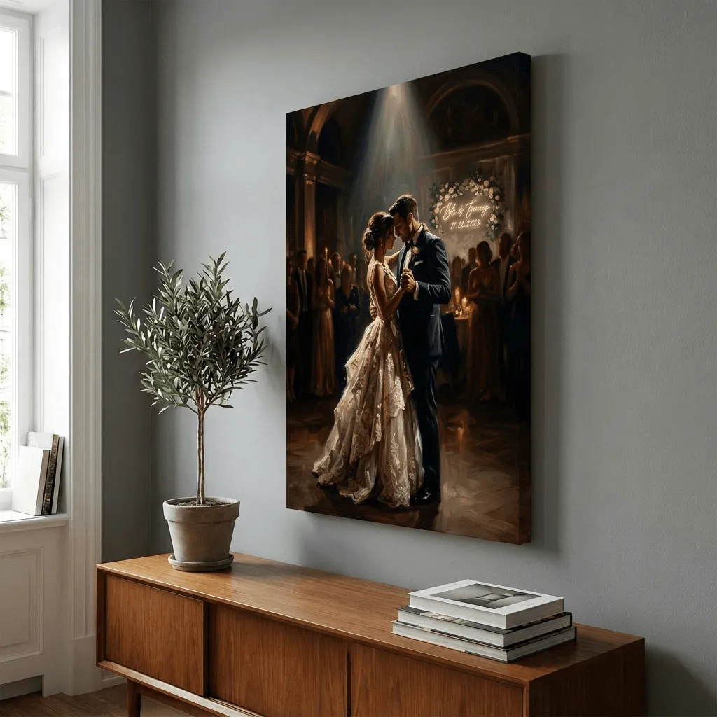 Rendered in rich oil paint with luminous golden tones and dramatic light rays, this romantic wedding scene captures an intimate first dance moment. A stunning canvas print that transforms any space with its warm, elegant atmosphere and timeless celebration of love.