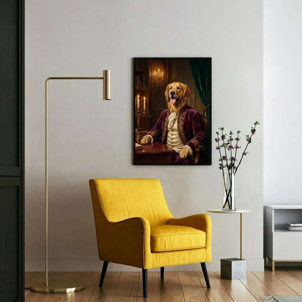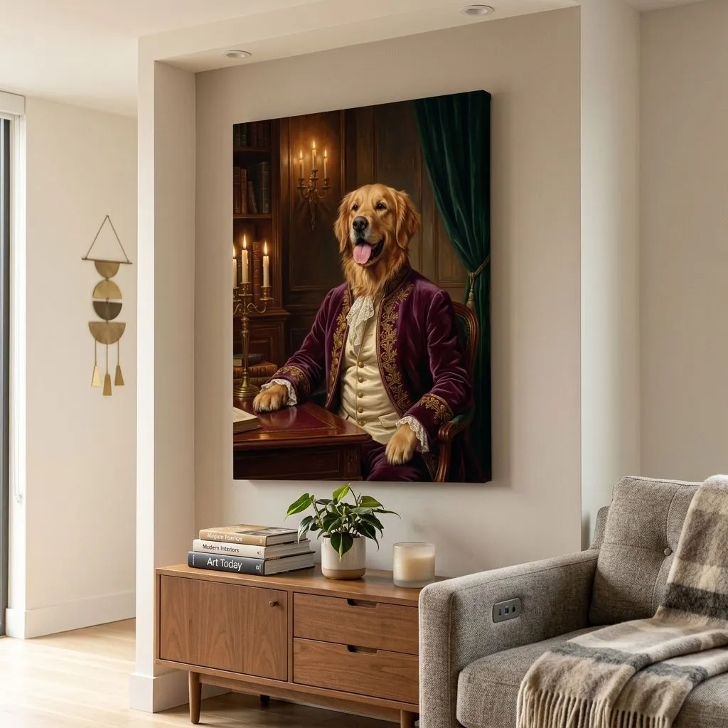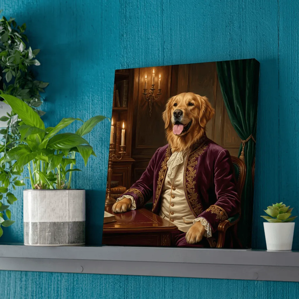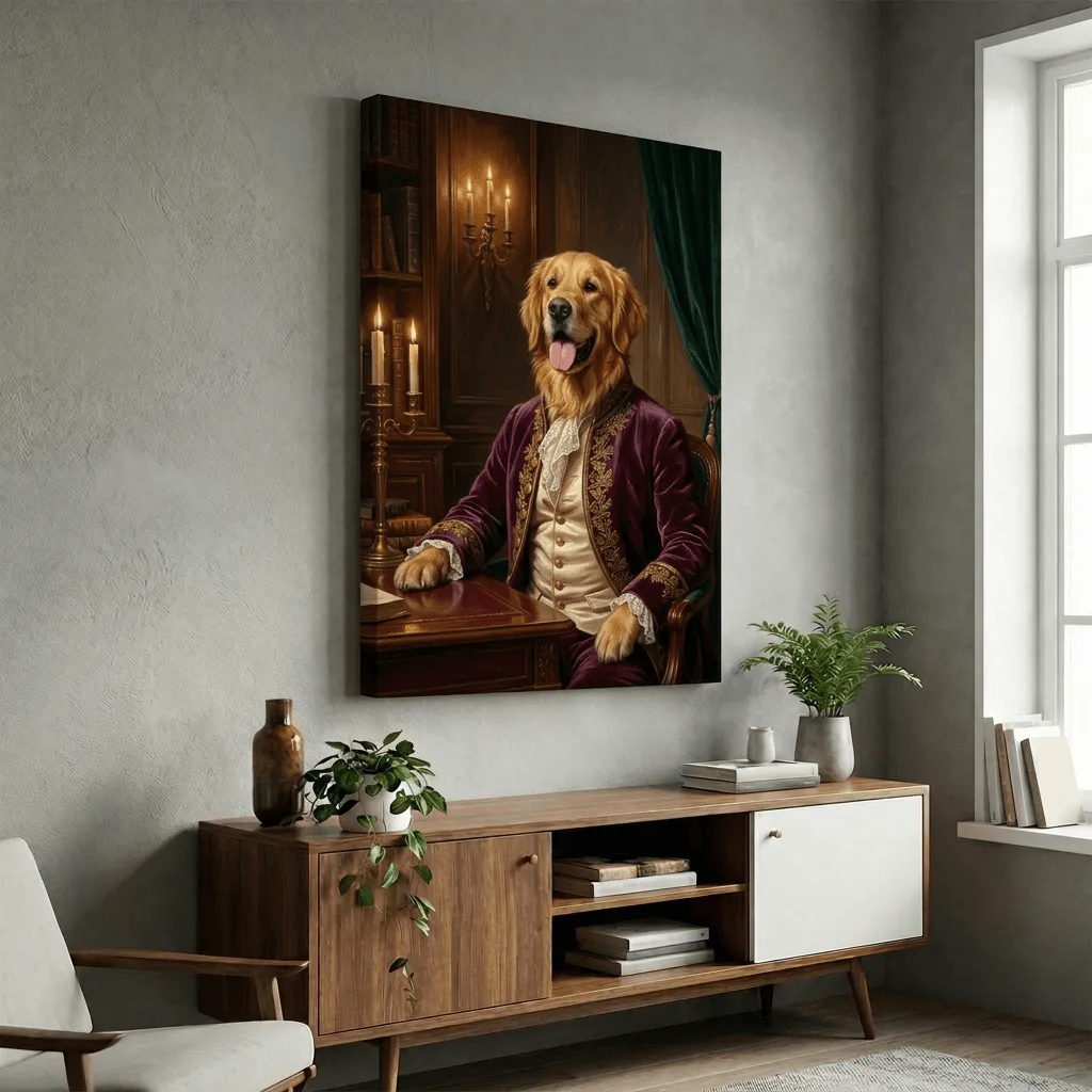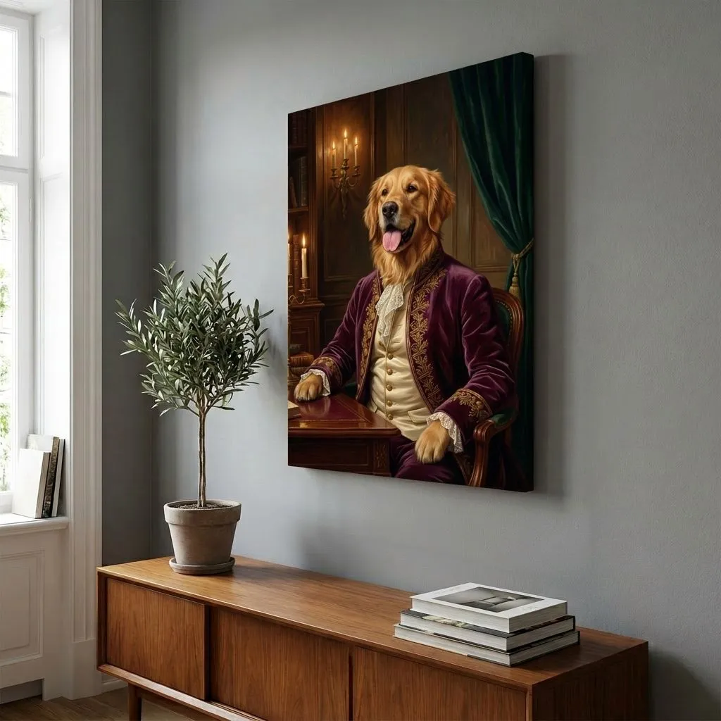 Rendered in rich oil paint textures, this whimsical portrait features a golden retriever dressed in ornate 18th-century royal attire with burgundy velvet and gold embroidery. A stunning canvas print that brings playful elegance and character to any room.