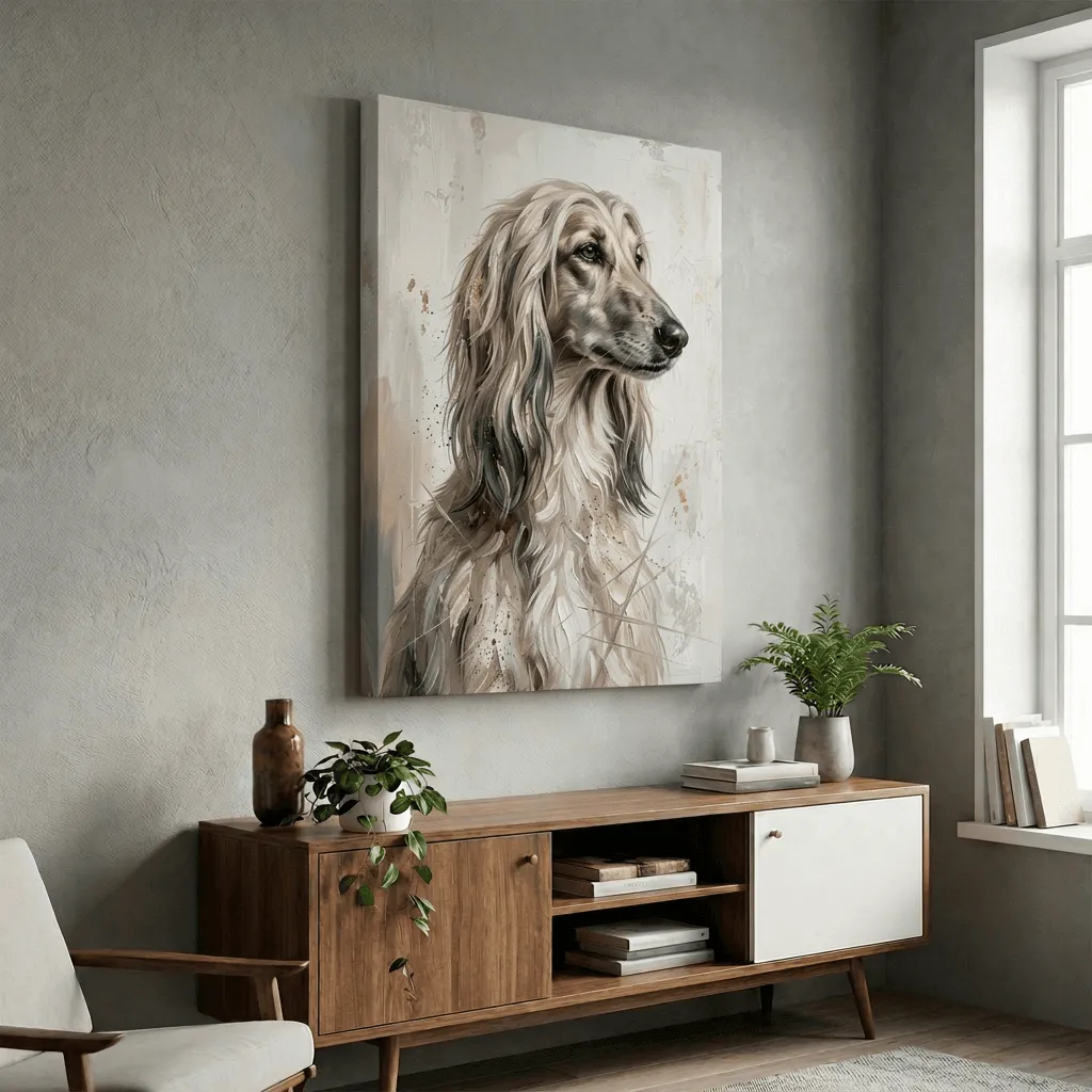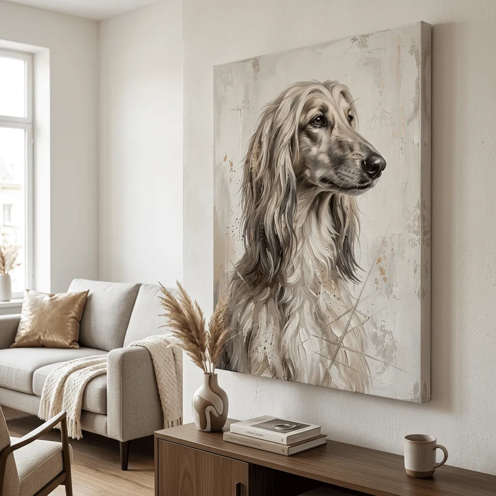 This striking oil painting captures a graceful long-haired dog in profile with rich, flowing brushstrokes and warm neutral tones. Golden accents and splattered details add depth and movement to this elegant canvas print, perfect for dog lovers seeking sophisticated pet wall art.