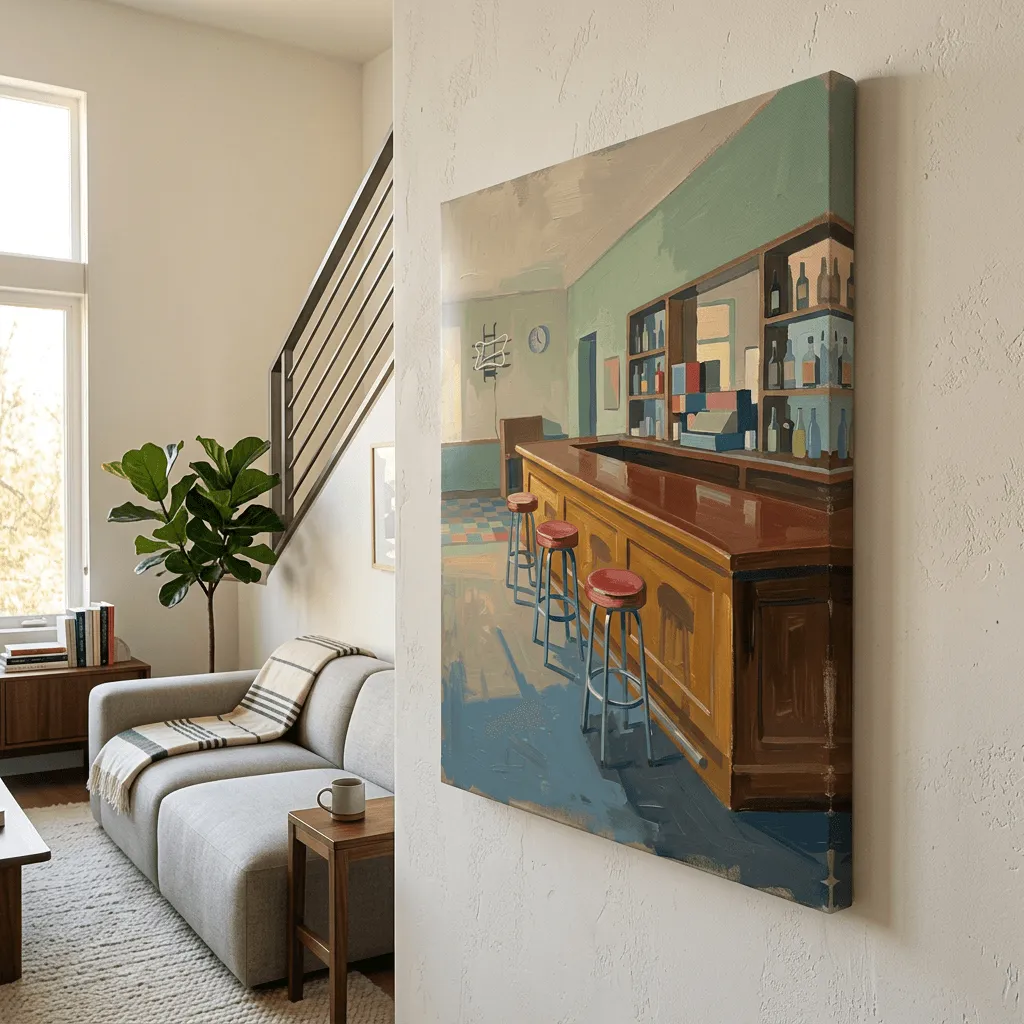 Rendered in rich oil paint with warm amber and sage tones, this retro bar scene captures vintage Americana charm. A striking canvas print perfect for kitchens, dens, or entertainment spaces seeking nostalgic home decor.