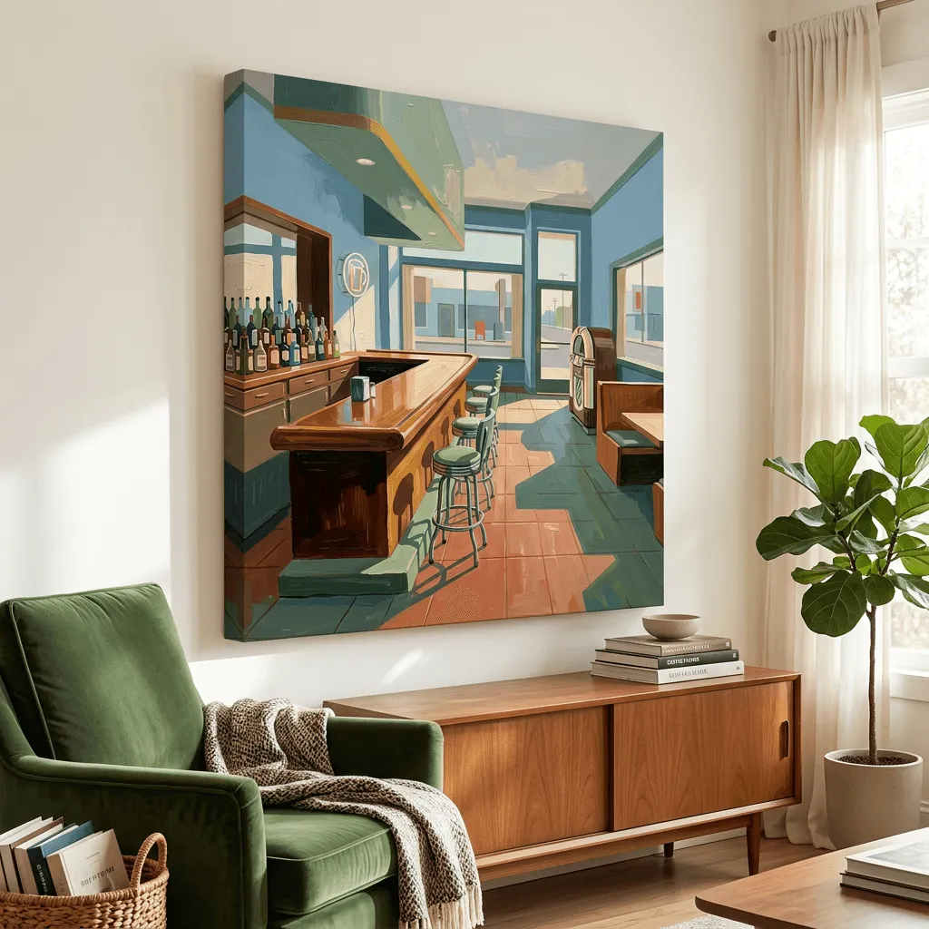 Rendered in rich oil paint with bold brushstrokes and warm amber lighting, this retro diner scene captures mid-century Americana charm. Perfect canvas print for kitchens, diners, or vintage-inspired spaces seeking nostalgic wall art.