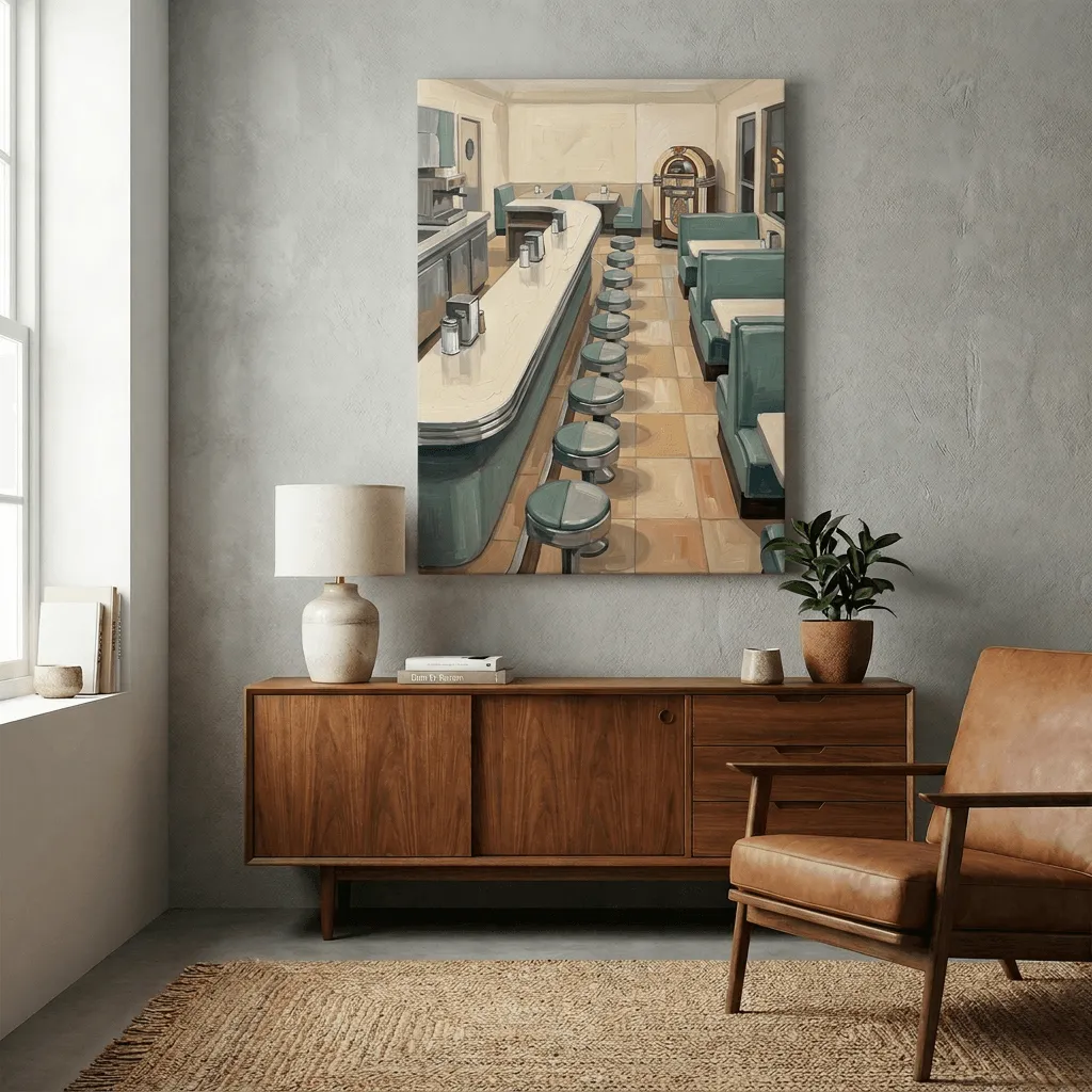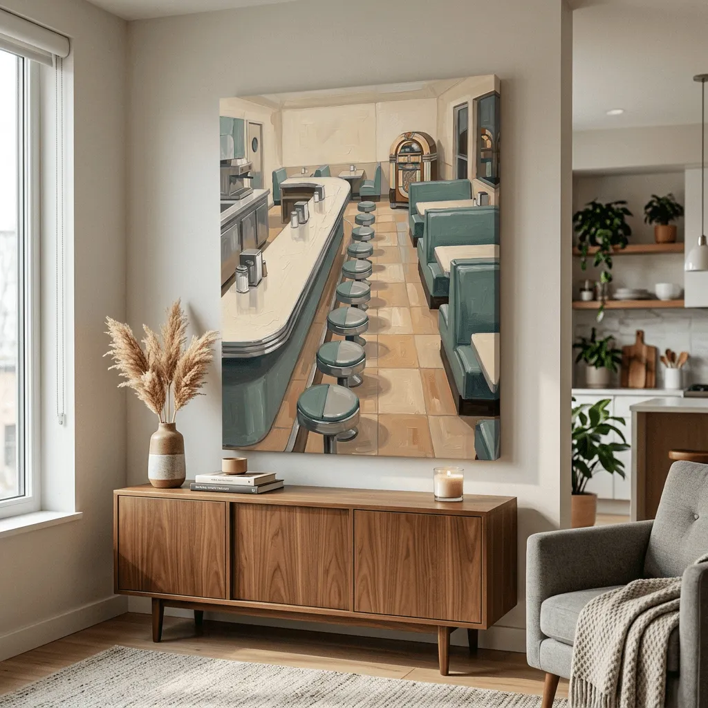 Rendered in rich oil paint textures with warm amber and sage tones, this retro diner scene captures nostalgic Americana charm. The stylized interior composition with iconic chrome stools and vintage jukebox creates an inviting canvas print perfect for kitchens, diners, or vintage-inspired spaces.