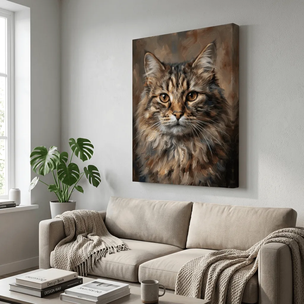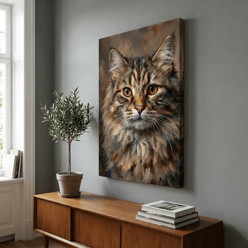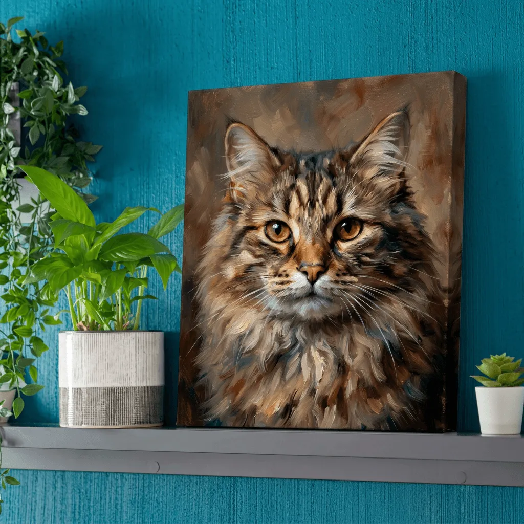 Rendered in rich oil paint textures with warm earth tones and golden amber eyes, this striking tabby cat portrait captures intricate fur detail and expressive feline character. A captivating canvas print that brings warmth and personality to any room.